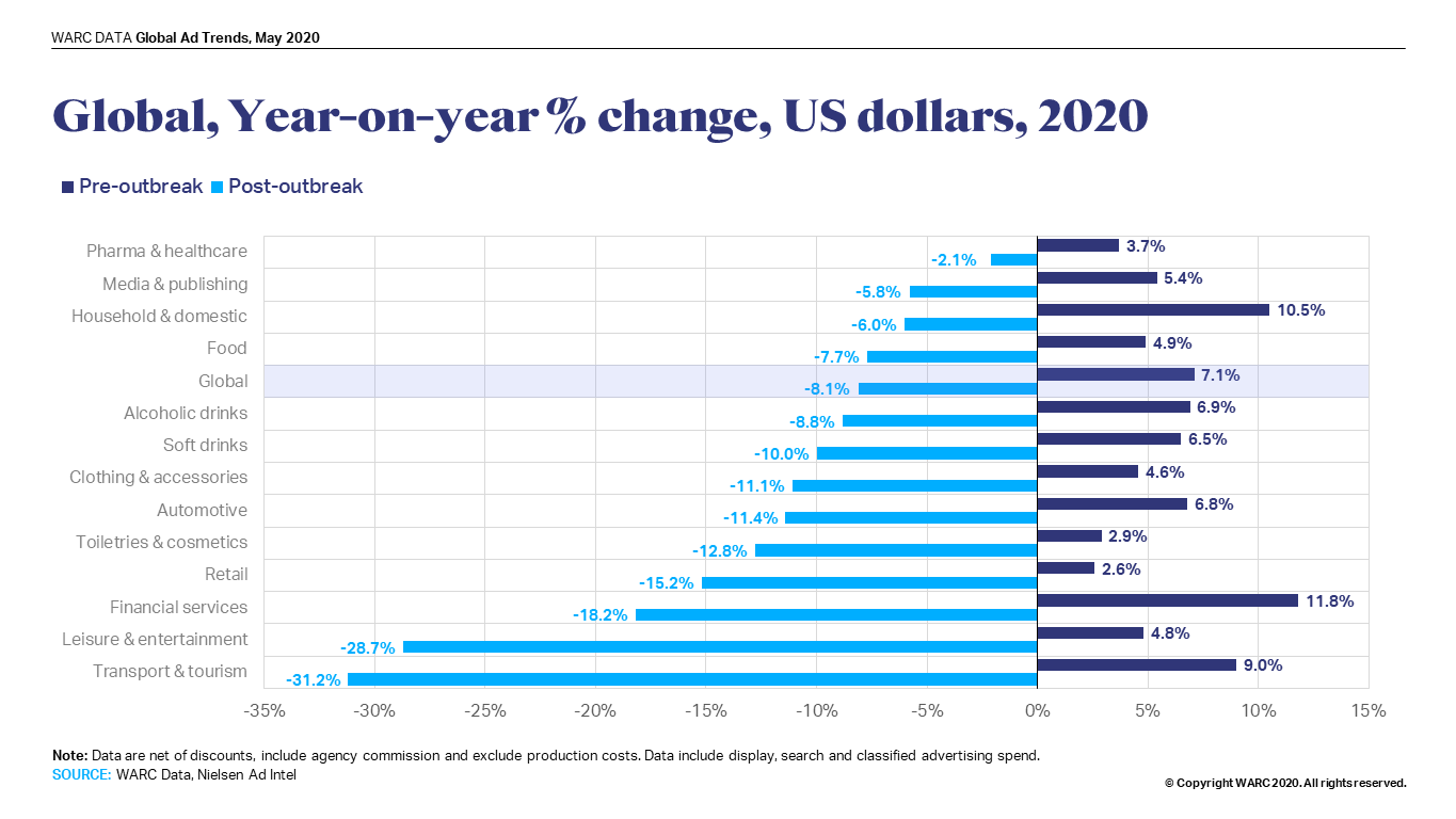 由于COVID-19的爆发,主要产品部门的投资大幅削减,今年全球广告支出将下降8.1%,降至5630亿美元。