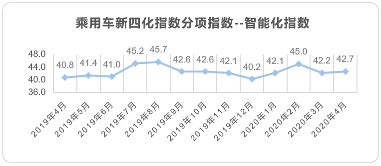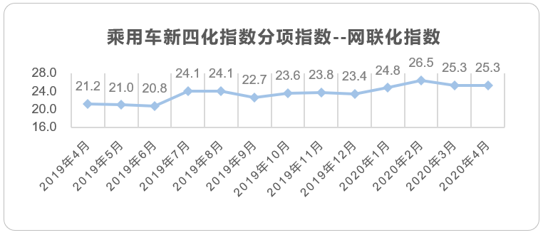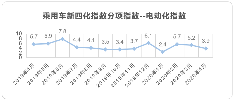 2020年4月的整体乘用车市场已经进入疫后复苏的状态,虽然同比销量仍处于负增长,但相比疫情期间已大幅好转。相对应的,新四化的发展也逐渐进入常态化发展阶段,整体新四化指数回归正常水平。其中,受传统燃油车需求大幅提升,而新能源车的私人购车意愿未被完全激发的影响,电动化指数恢复到19年下半年(除12月)的正常水平;智能化指数也恢复到19年第四季度的水平;唯独网联化指数一直保持稳步缓慢上升的态势,几乎6个月会有一次明显的提升。