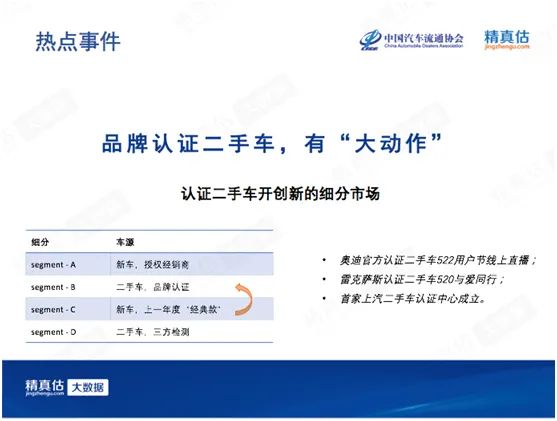 一直以来,品牌官方以往很少做二手车方面的推广,“奥迪官方认证二手车522用户节线上直播”的宣传是有史以来力度最大的;豪华品牌中,追随者还有雷克萨斯推出“认证二手车520与爱同行”;上汽荣威名爵品牌在二手车认证方面也有进展,5月30日首家上汽二手车认证中心在上海成立。品牌认证二手车已经覆盖到豪华品牌、主流合资品牌、自主品牌。从2019年起,主流厂商已经不再以车身尺寸来划分细分市场了,取而代之的是“定价和品质”成为细分市场的依据。在这个背景下,新车市场出现了很多“经典款”车型实际是比较旧的技术,减配后的车型重新上市,例如“轩逸经典款”、“途观丝路版”。与这类新车相比,有品牌背书的认证二手车是更好的选择,给消费者更大的价值。因此品牌认证二手车可以说是逆势上涨、盘活存量,创造了一个新的细分。