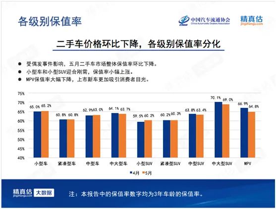 各级别保值率:二手车价格环比下降,各级别保值率分化