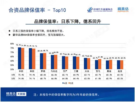 2020年6月1日,中国汽车流通协会和精真估联合发布了《2020年5月中国汽车保值率研究报告》。通过保值率研究旨在反应该品牌的产品力、认知度、美誉度等综合实力,并通过深入研究对未来开展回购、置换、租赁、金融、新车定价参考等相关业务提供重要数据参考,从而降低业务风险,提高经营效率。