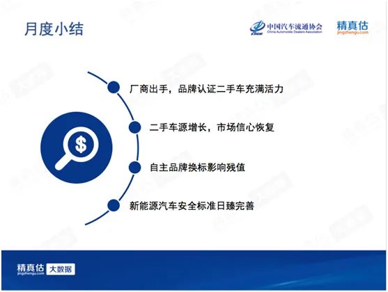 本月以奥迪、雷克萨斯、上汽为代表的厂商推广其品牌官方认证二手车,以厂商牵头推广其检测、整备、认证、零售等保值营销服务,与新车相比,有品牌认证的背书是更好的选择,给消费者带来更大的价值,因此品牌认证二手车可以说是逆势上涨、盘活存量,创造了一个新的细分。线上二手车车源全面恢复且高于去年同期数据,市场信心充分恢复,车商利用此机会大力开展营销活动。自主品牌的换标影响残值,各品牌保值率上升下降各异。两会期间三项强制国家标准发布,安全受重视。