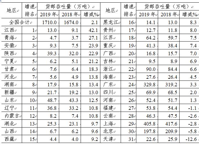 货邮吞吐量增速超过10%的12个省(区、市)中,中西部地区有9个:江西(42.1%)、青海(27.1%)、安徽(23.9%)、陕西(22.9%)、宁夏(21.2%)、甘肃(18.3%)、湖南(13.4%)、新疆(13.0%)、内蒙古(10.8%)。