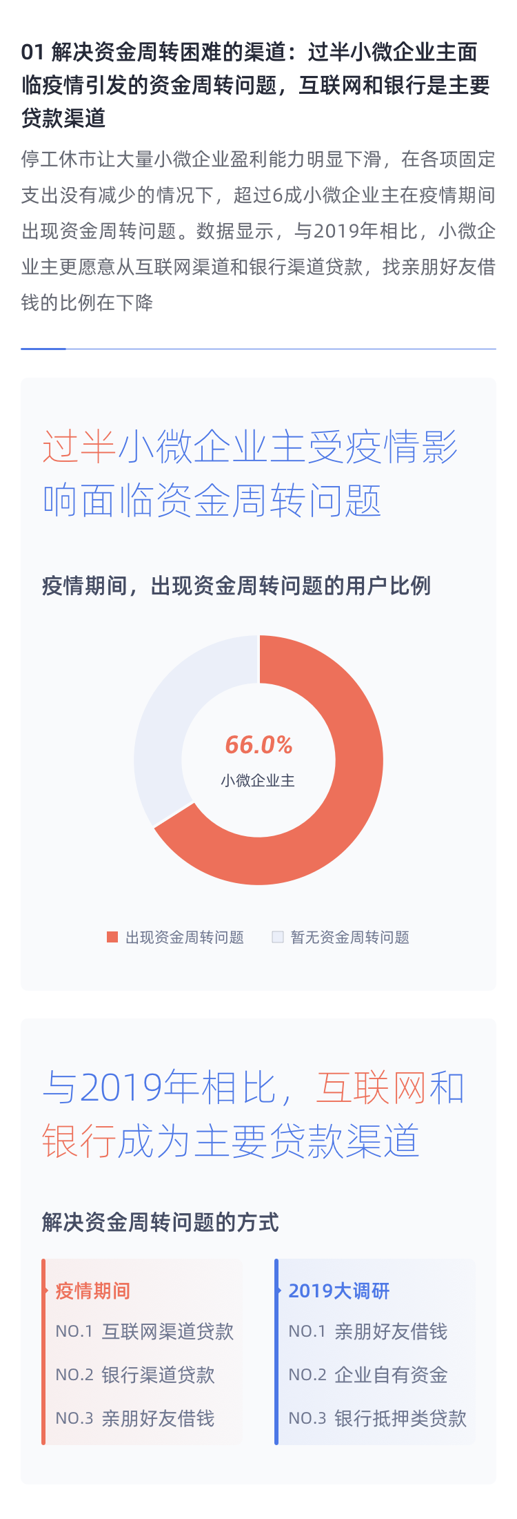 微众银行&CDC:疫情下用户金融需求研究-贷款篇 2020年3月银行用户体验联合实验室发起了疫情下用户金融需求的研究。在本次调研中对疫情期间和疫情之后用户金融需求做对比分析和趋势预估。 突发的疫情给全国上下带来巨大冲击,中小企业无法复工复产、盈利能力普遍下降,但存货仓储费、办公场所租金和员工薪水福利等还在固定支出,收入锐减而支出照旧让大量小微企业主面临资金周转的问题。同一时间,政府和金融机构果断行动,不断加大对小微企业贷款的支持力度,扩大金融服务的覆盖面,全力支持小微企业复工复产。 贷款篇中聚焦小微企业主群体,了解他们在疫情影响下对贷款服务的需求差异和态度行为的改变。 ” 更多阅读:CDC:新研究揭示了肥胖与年龄和人体生物酶之间的潜在深度联系CDC:为什么女性往往比男性的寿命更长久?微众银行:2020银行业用户体验大调研报告微众银行积极提供金融支持 助力企业复工复产微众银行满足各客群需求 提供差异化金融服务CDC:新研究发现未接种疫苗的人死于新冠的可能性是其他人的 11 倍CDC:美国猴痘病例数超2.1万例 专家称病例增速放缓CDC:2021年美国有近10.8万人死于药物过量CDC:第三剂新冠疫苗对预防奥密克戎感染住院的有效性从91%下降到78%微众银行&罗兰贝格:2024年中国汽车金融报告(附下载)CDC:2023年美国出生率统计报告CDC:研究发现骨强度仅提高3% 髋部骨折率就可降低45%美CDC:2021年美国人的预期寿命下降到76.4岁CDC:2020年美国人均预期寿命缩短1.8岁美国CDC:2020年十大死因 心脏病排名第一