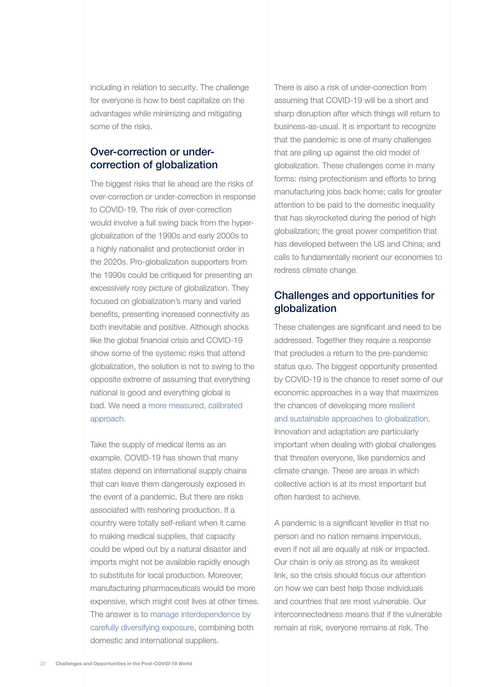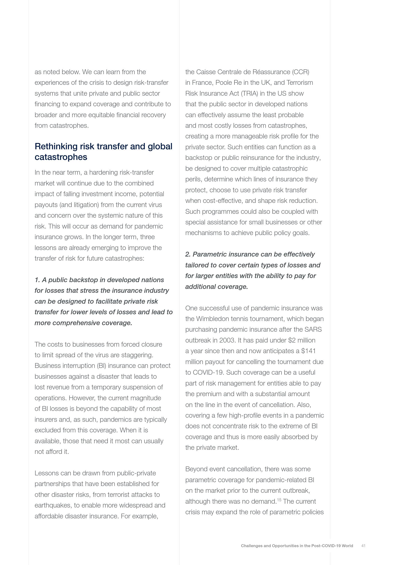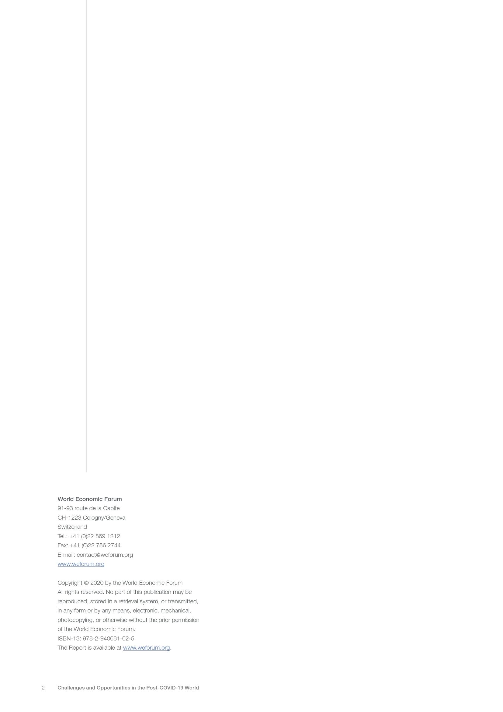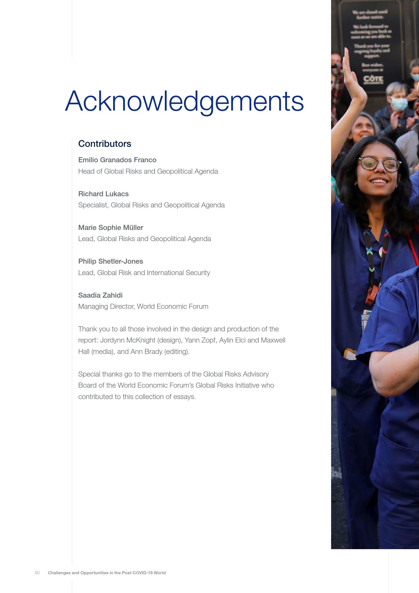 世界经济论坛执行董事Saadia Zahidi说:“新冠疫情不仅夺去了许多生命,也让很多家庭衣食无着。随之而来的经济危机影响深远,暴露了既往做法的不足之处。在控制大流行病直接影响的同时,领导者还必须紧密合作,联合社会各界应对已知风险,并提高复原力来应对未知风险。我们现在应当化危险为机遇,采用新思路与新方法,提高经济的可持续性、韧性和包容性。”