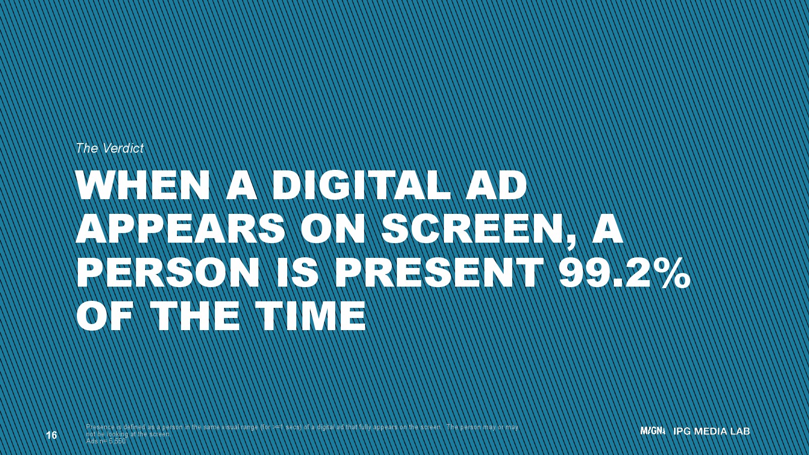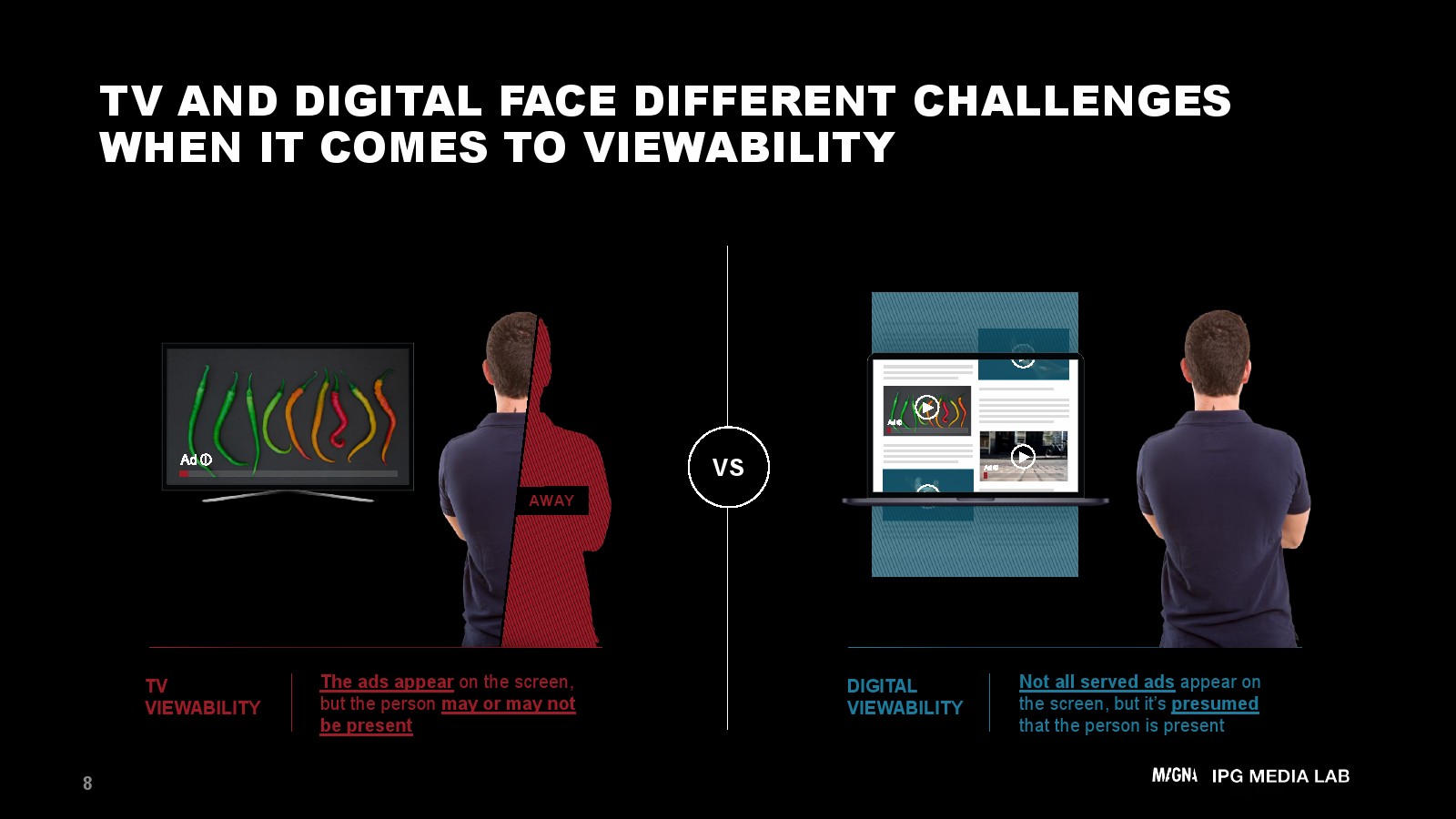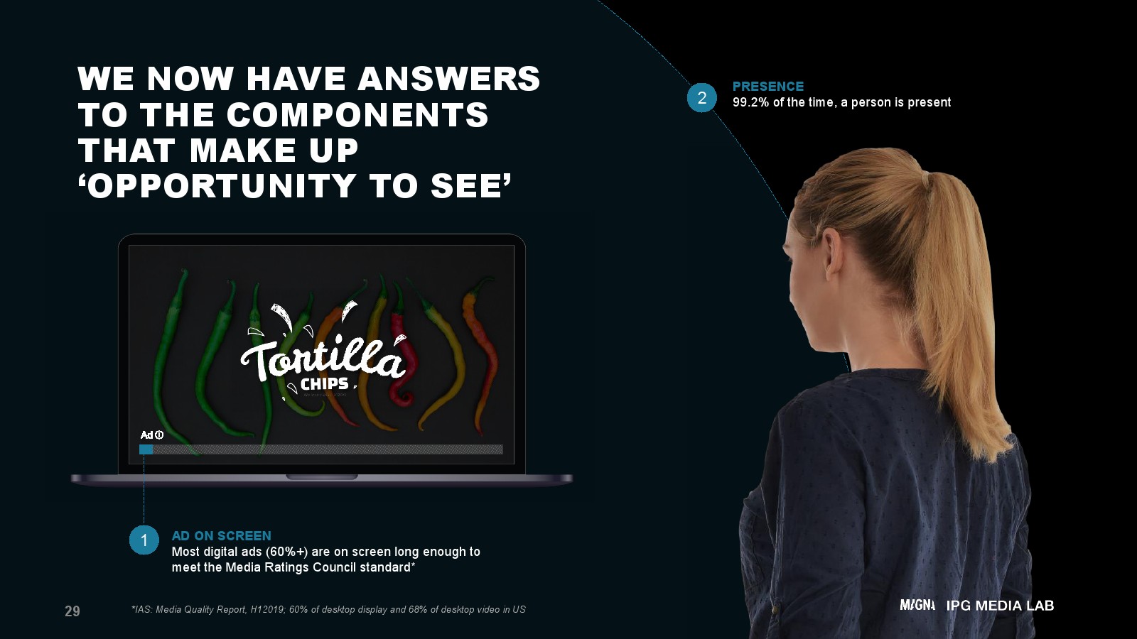 MAGNA发布了新报告“解剖观看的机会”。鉴于人们经常在广告时段离开房间,这种人类“在场”的概念是电视广告普遍关注的问题。MAGNA、IPG媒体实验室和TVision最近量化了一个广告在一个空房间播放的频率,占29%的时间。作为后续研究,MAGNA和IPG媒体实验室的一项新研究测试了数字广告出现在屏幕上时有人在场的假设,试图量化数字广告在没有在场的情况下出现的频率。