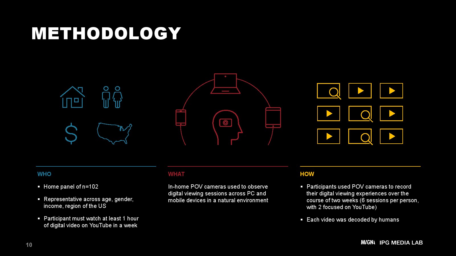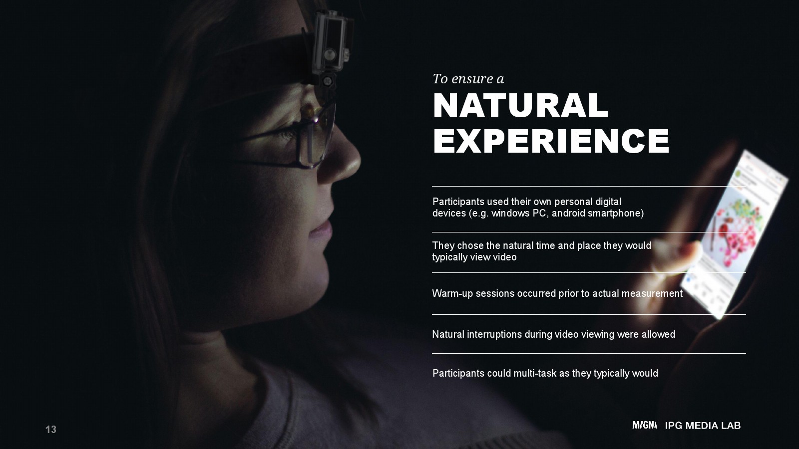 在这项研究中,参与者使用家用POV(视点镜头)相机记录了他们在自然环境中通过PC和移动设备在两周内的数字观看体验。相机被安装在参与者的头部,以便获得他们相对于数字设备的位置视图,并在他们的PC和移动设备上打开屏幕记录器来捕捉屏幕上的内容。这项研究包括102名参与者,记录和分析了1004个小时的视频。