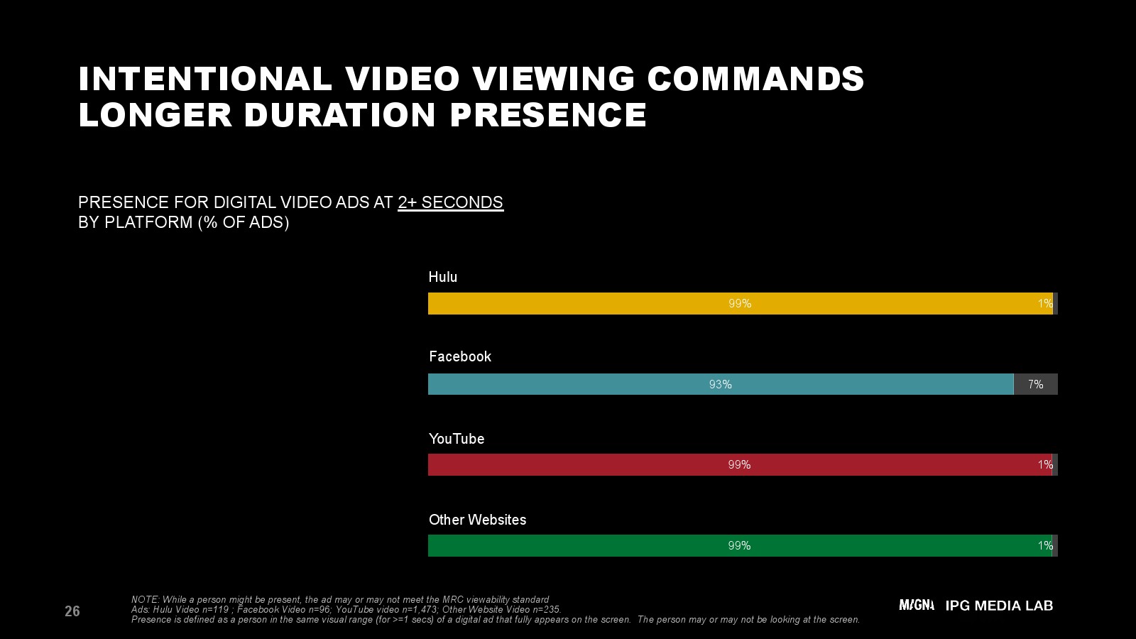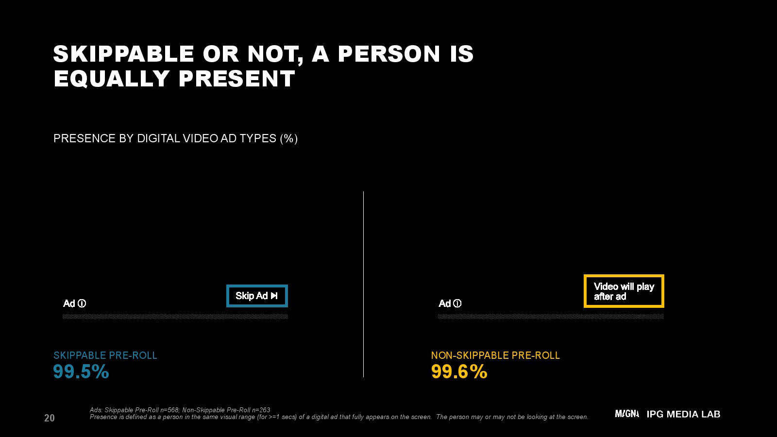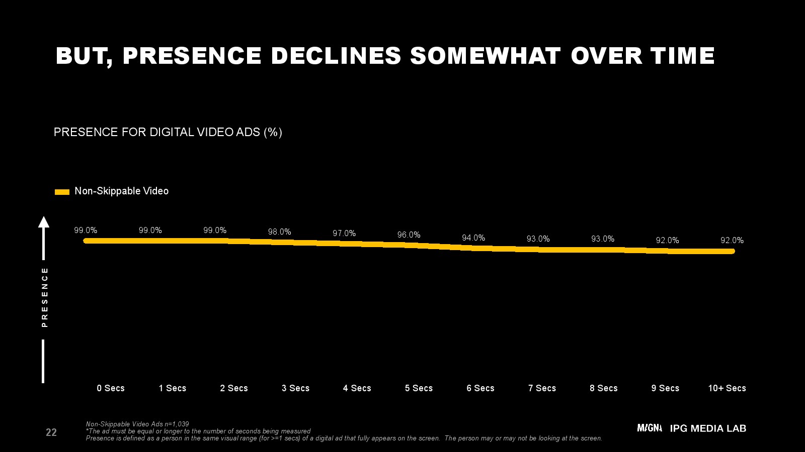 这项研究的一个主要发现是,虽然一开始存在的比例非常高(99.2%),但它确实有所下降。例如,94%的不可跳过的视频广告在有人类在场的情况下播放达到6秒或更长时间。