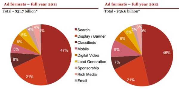 拆分细看美国数字广告细分市场在2011年和2012年的对比,搜索引擎广告和展示类的广告份额没有变化(但因为整体市场规模的增长,这两个市场的绝对规模值还是在增长),而像分类广告、Sponsorship类广告和富媒体广告则略有下降,甚至电子邮件广告的比例在2012年的比例为0%。增长比例最高的是移动广告,从2011年的5%增长到2012年的9%。