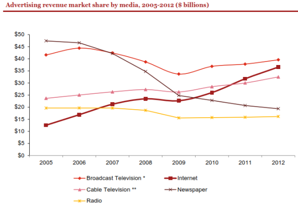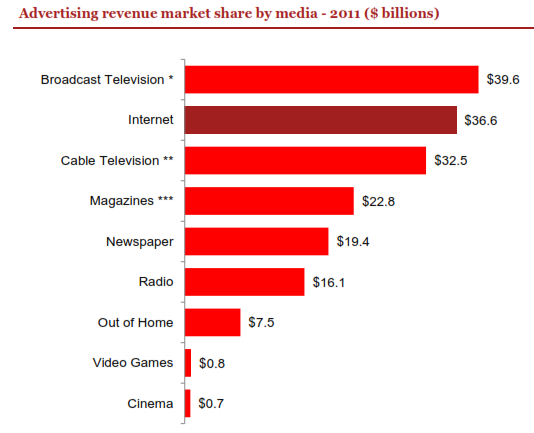 上图给出的美国2012年全美广告产业的营收媒体分布,广播电视依然是美国广告业最看重的媒体,2012年的广告营收为396亿美元,其次是互联网,为366亿美元(IAB给出的2012年数字广告规模为316亿美元,可见即使是互联网广告也并非全部都是数字广告,呵呵)