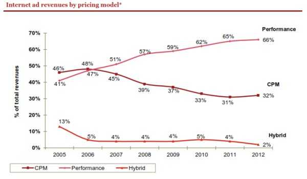 从定价层面看,基于表现(performance)的广告形式在整个数字广告营收的占比从2005年开始持续增长,到2012年这个比例增长到了66%,而基于CPM的广告形式的营收占比则在下降,只有在2006年和2012年略有增长。