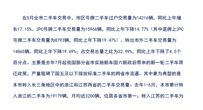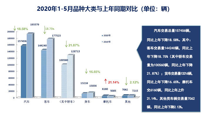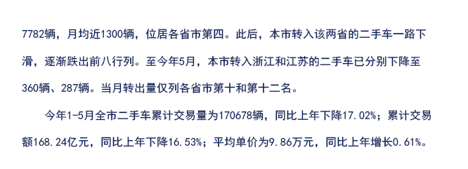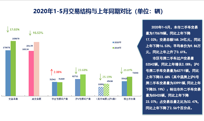 上海市1-5月份二手车交易量170678辆,同比上年下降17.02%,进入5月,上海市二手车交易量出席明显回落,当月二手车交易总量为45047辆,环比上月下降10.57%,同比上年下降8.77%,分析本市5月份二手车交易量环比下降的主要原因:一是“五一”小长假,交易天数环比上月减少了2天,二是5月起上海全面实施沪C号牌二手车交易新政,导致当月全市沪C号牌二手车交易量环比上月减少近1000辆,降幅9.81%,当月二手车交易总额为42.65亿元,环比上月下降10.12%,同比上年下降9.55%。具体分析如下: