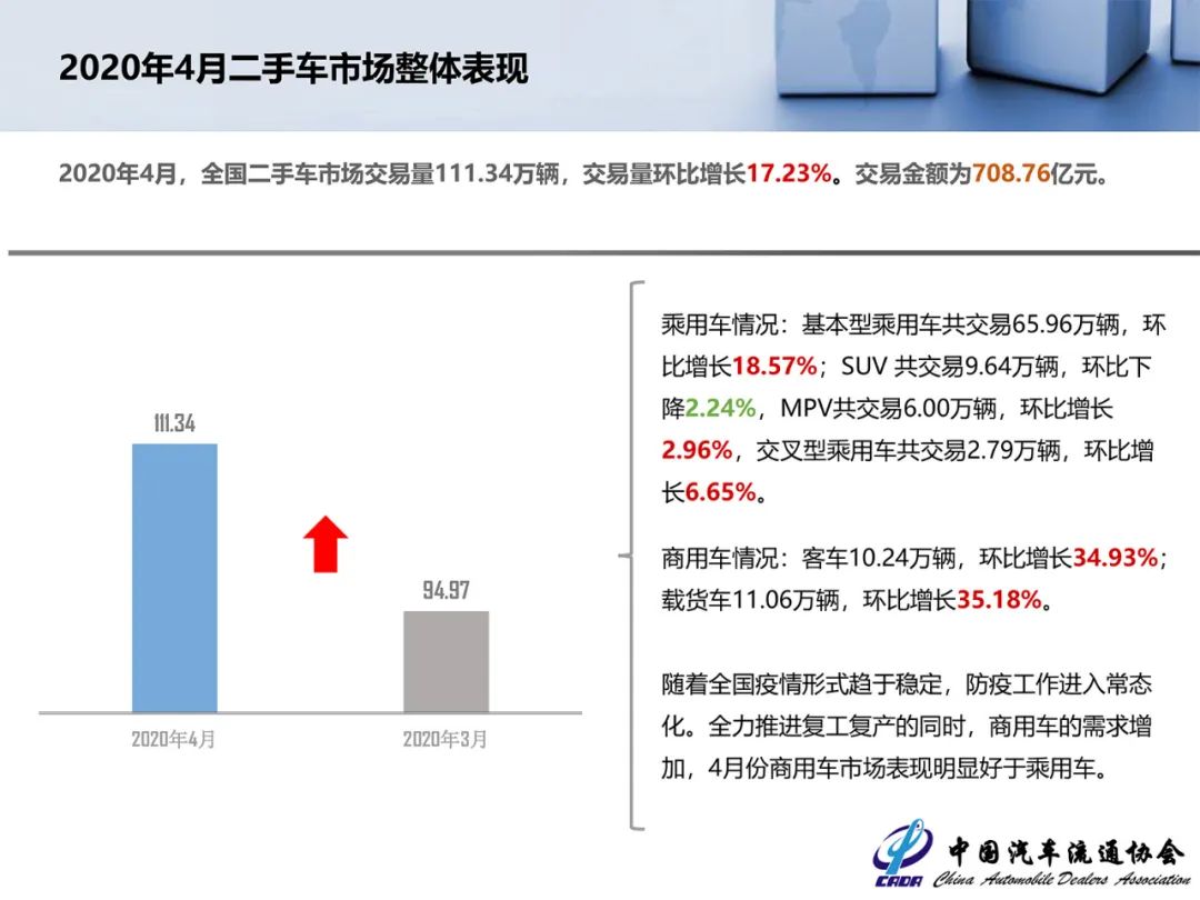 2020 年4月,全国二手车市场交易量111.34 万辆,交易量环比增长17.23%,交易金额为708.76亿元 。