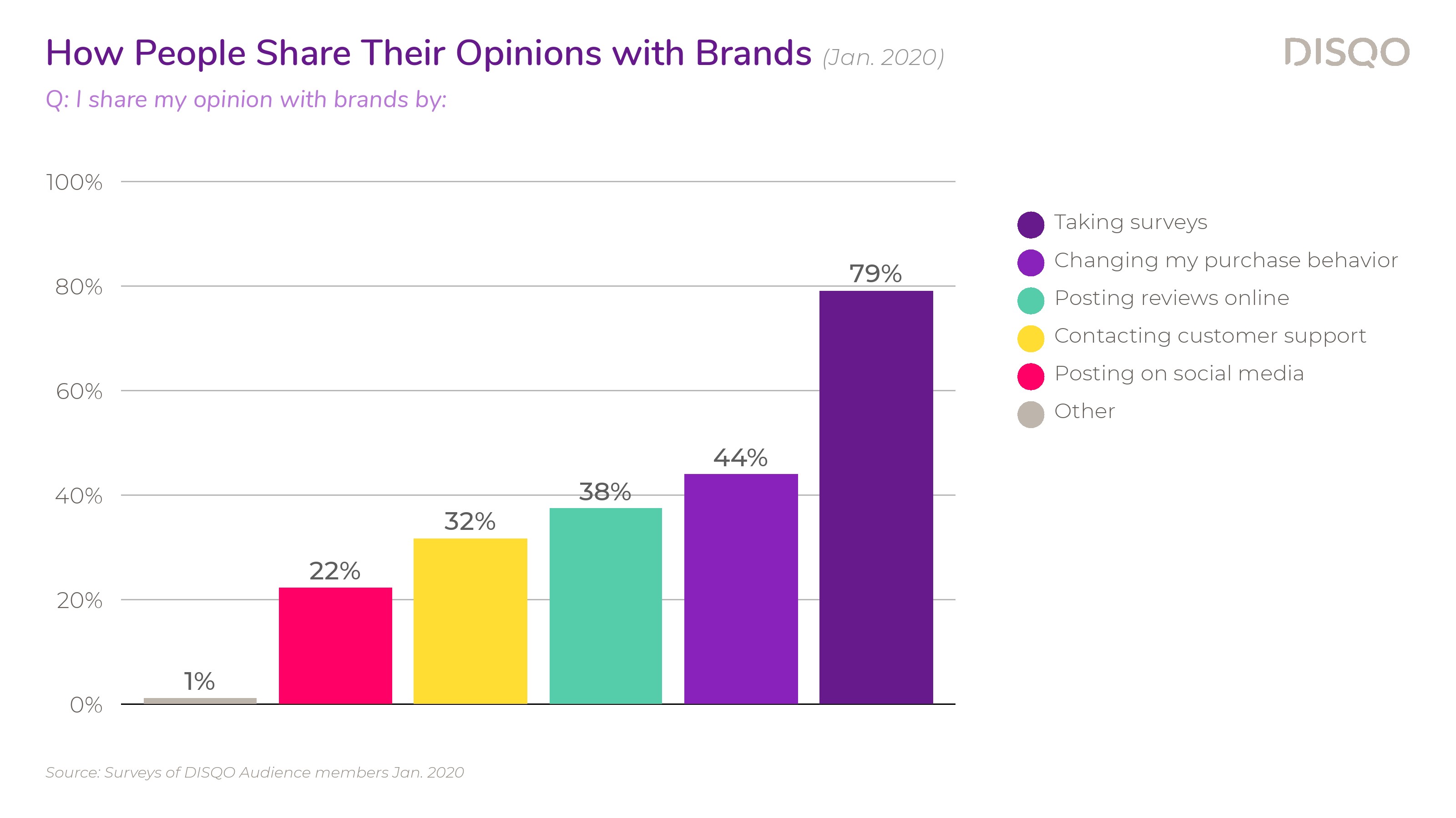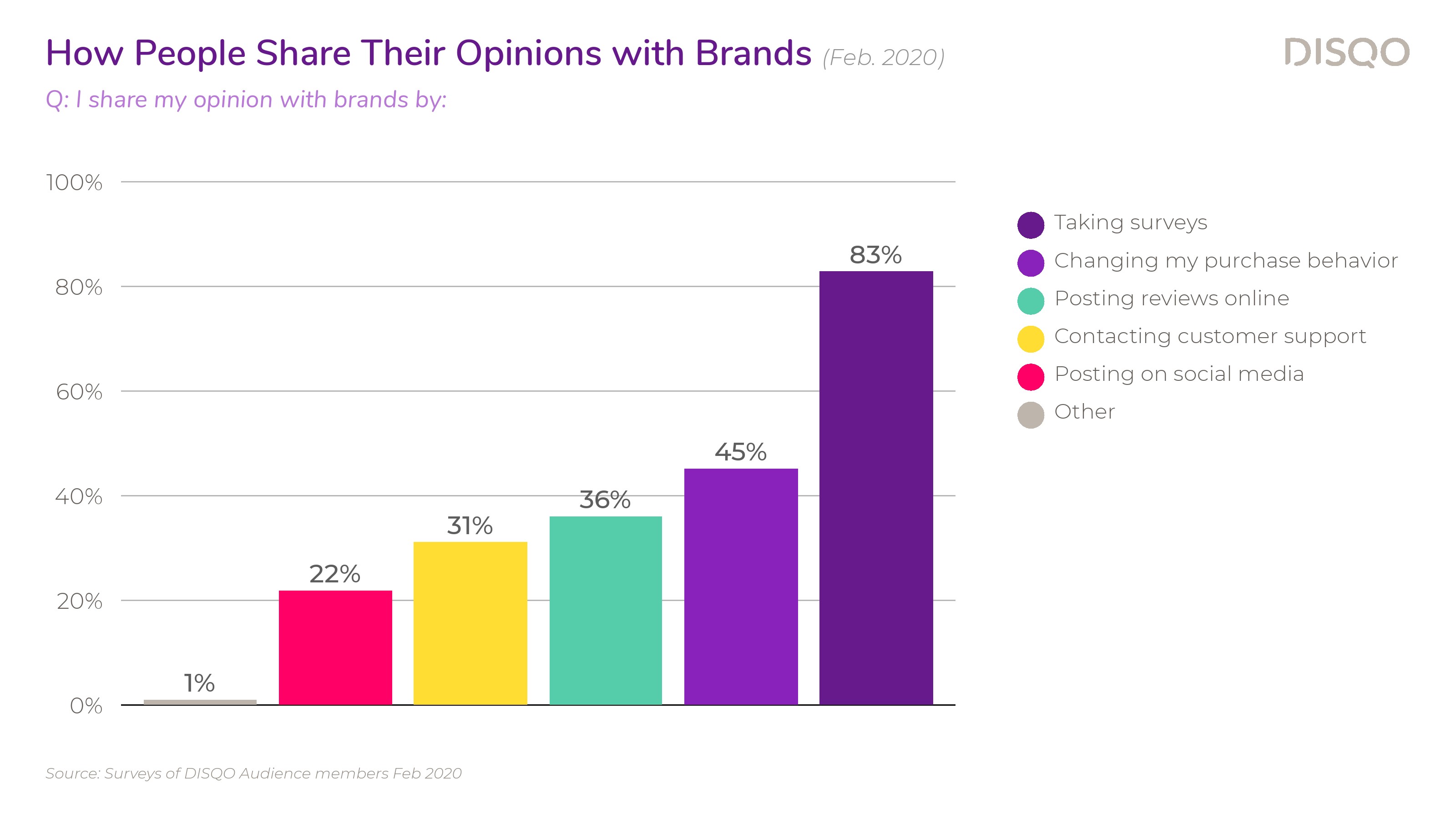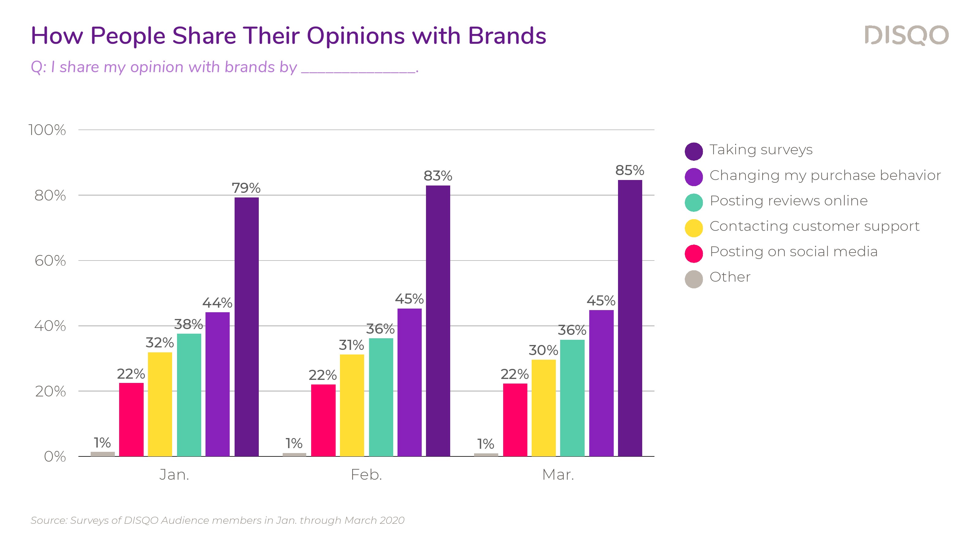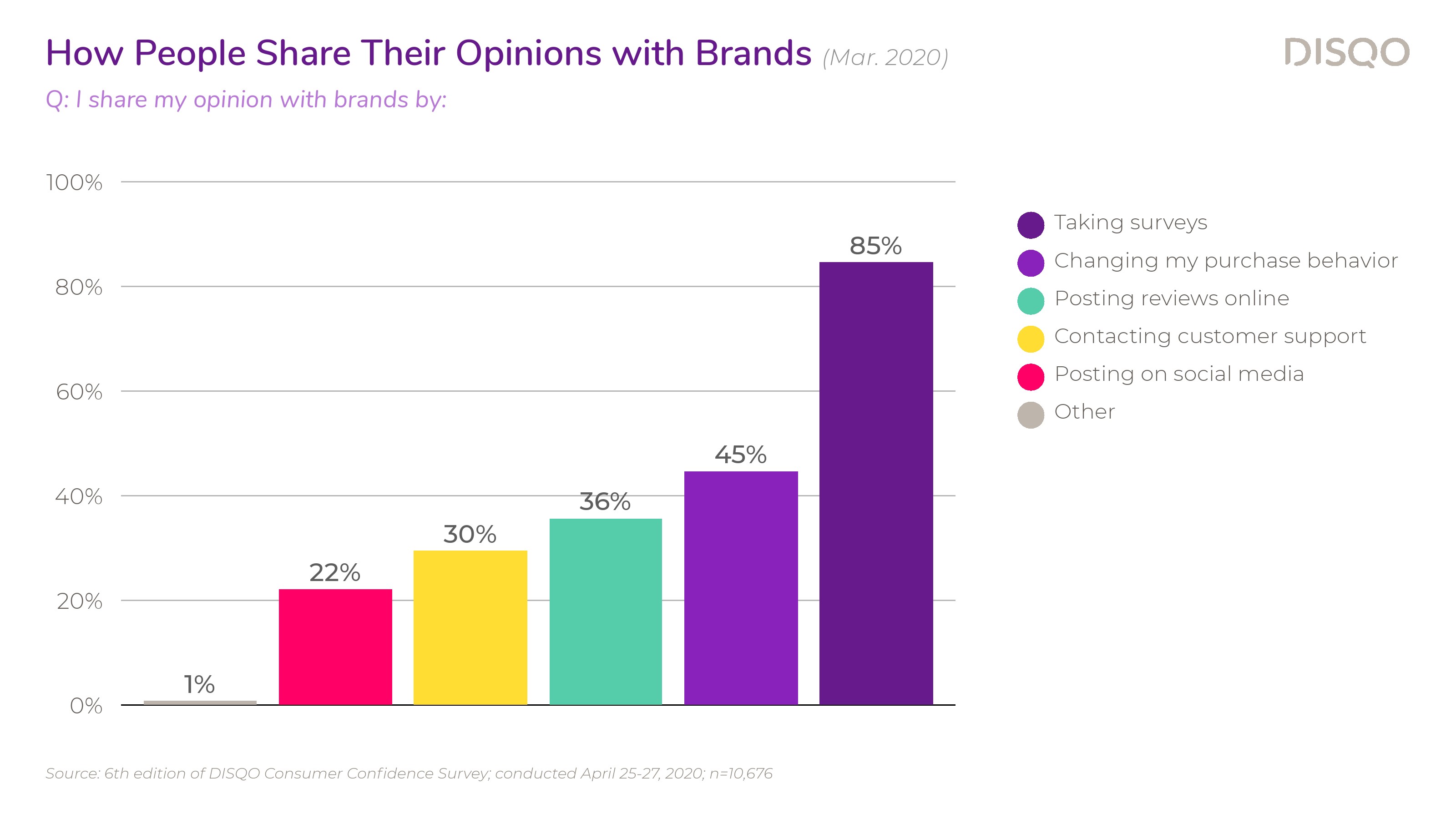 DISQO发布了“2020年春季消费者心声研究”,超过8/10的消费者(85%)通过调查与品牌分享他们的观点,这成为最受欢迎的反馈方式。
