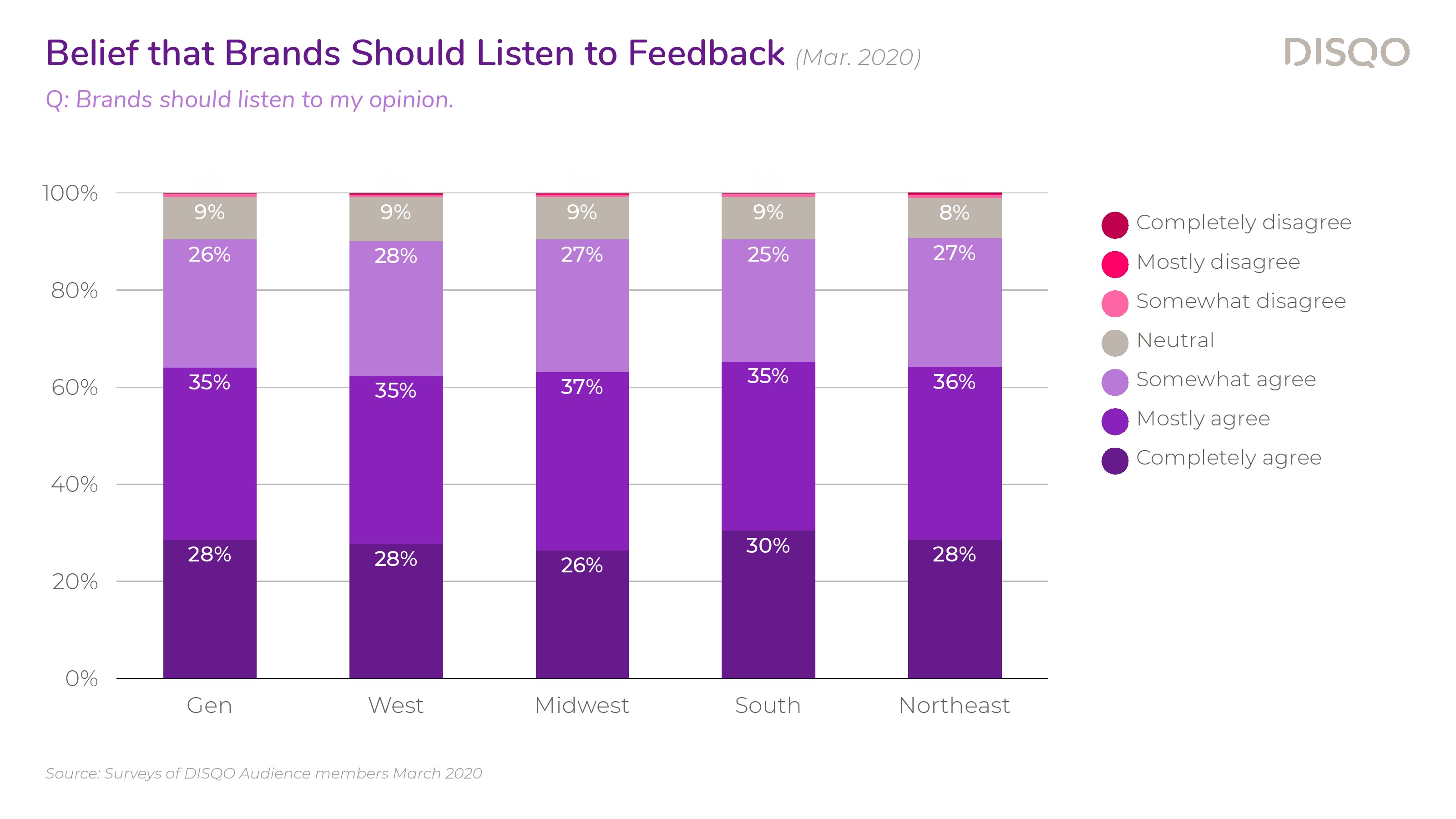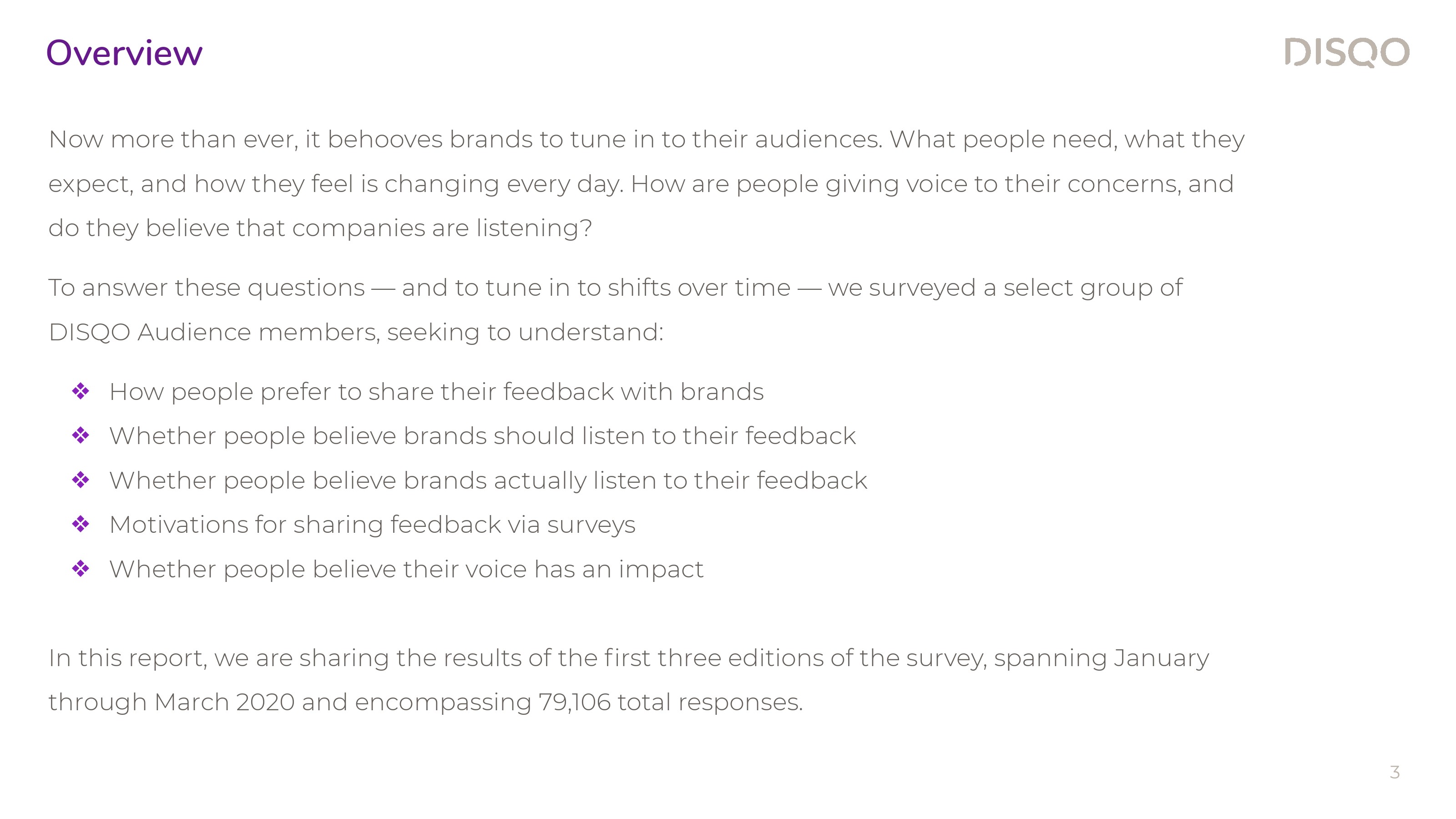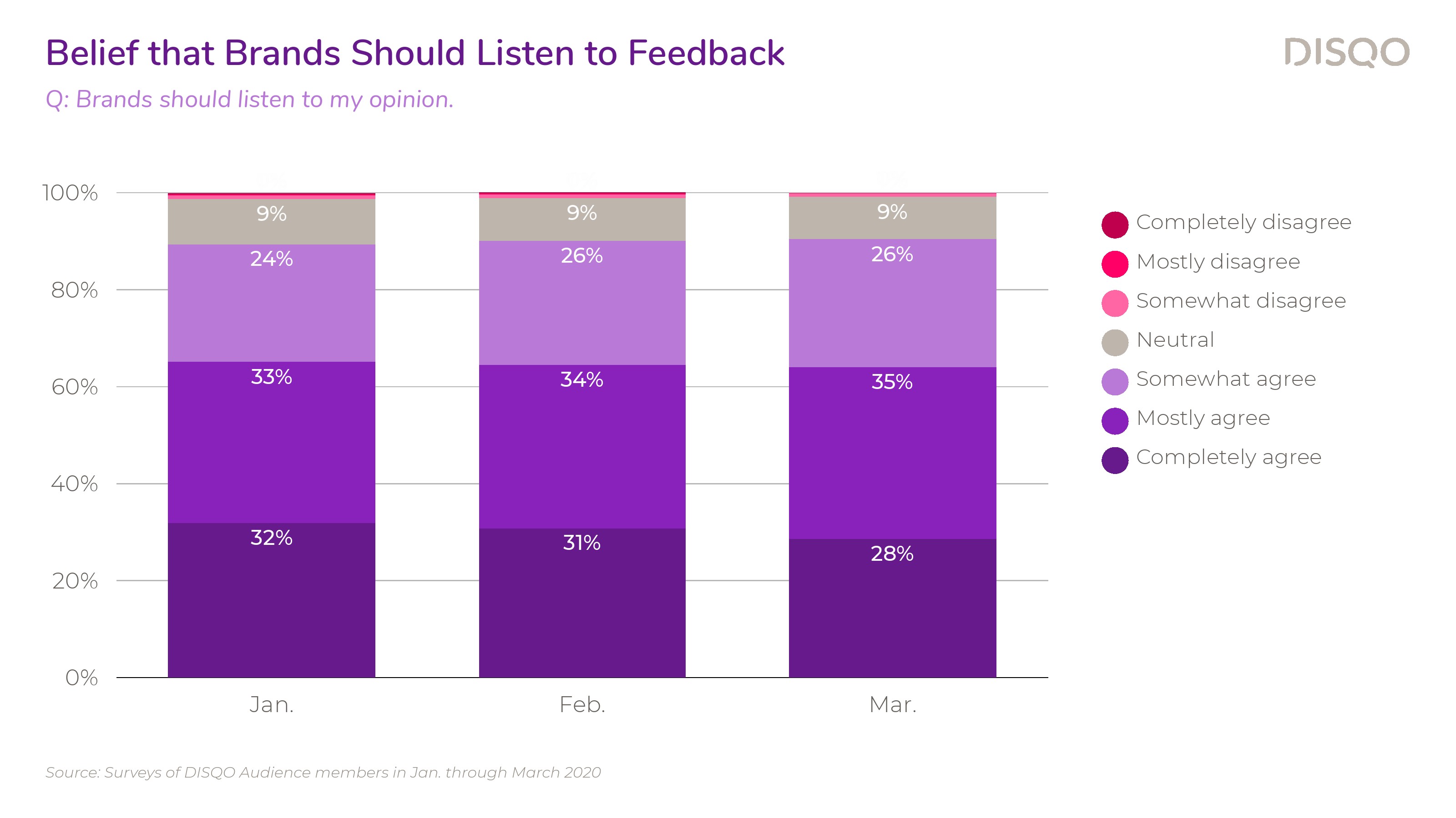 DISQO发布了“2020年春季消费者心声研究”,超过8/10的消费者(85%)通过调查与品牌分享他们的观点,这成为最受欢迎的反馈方式。