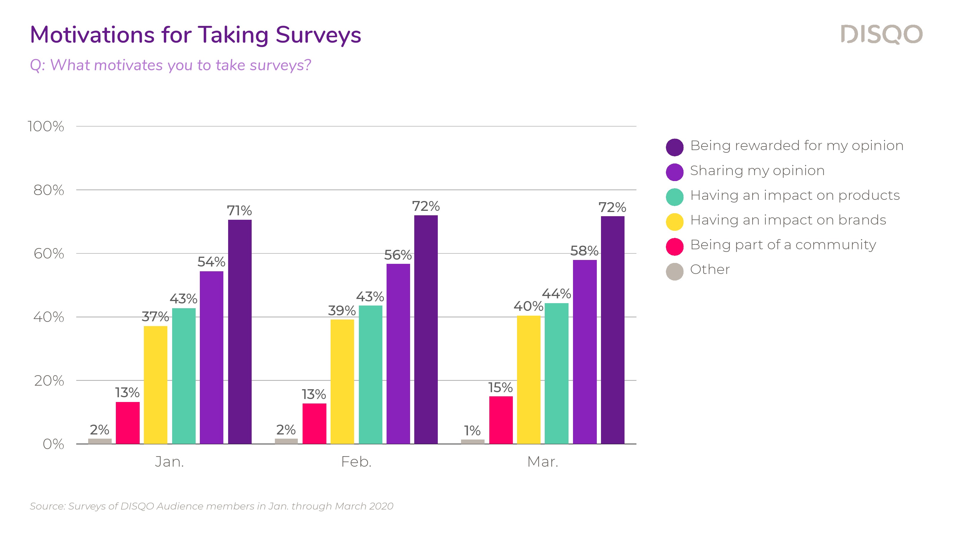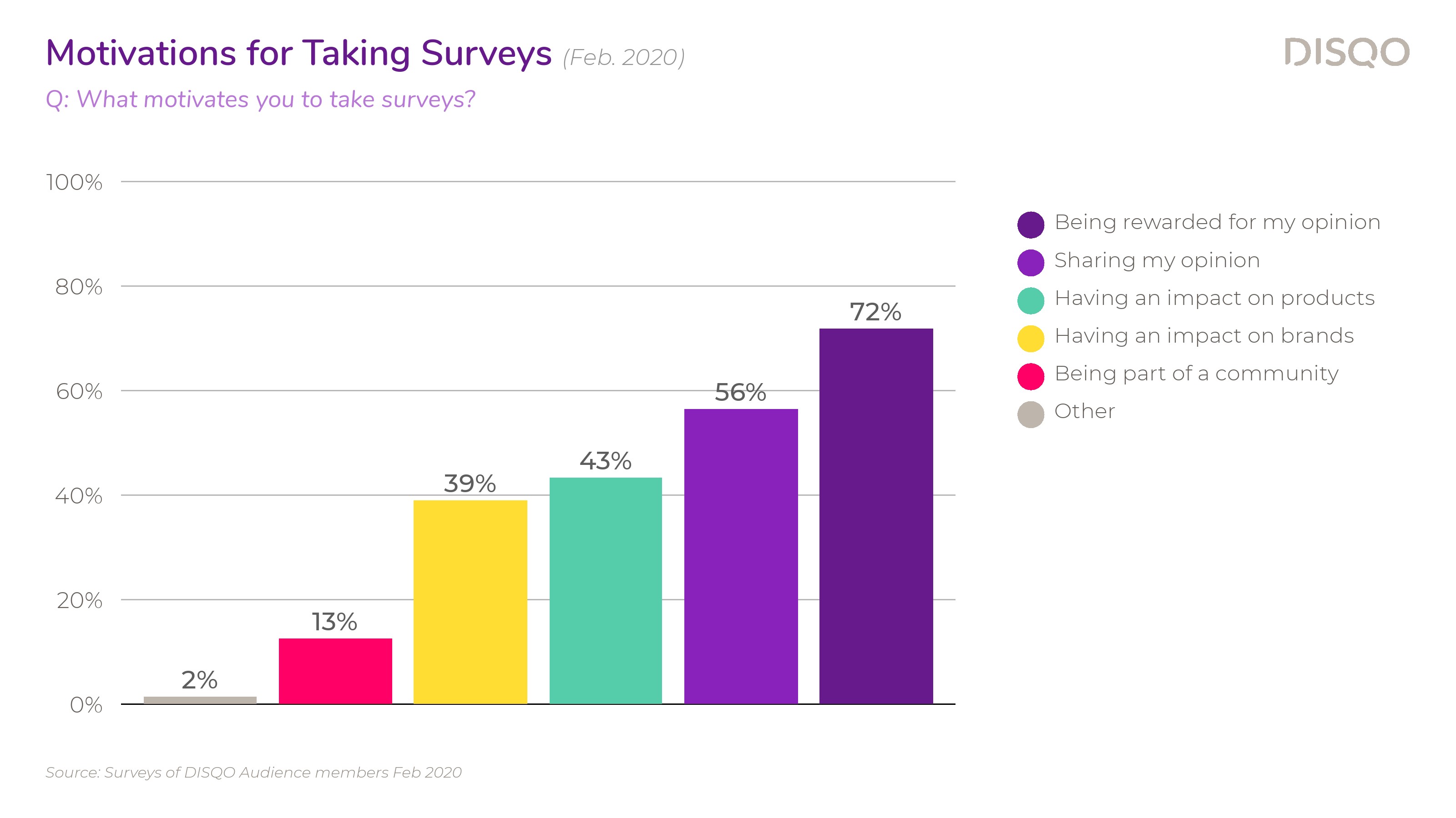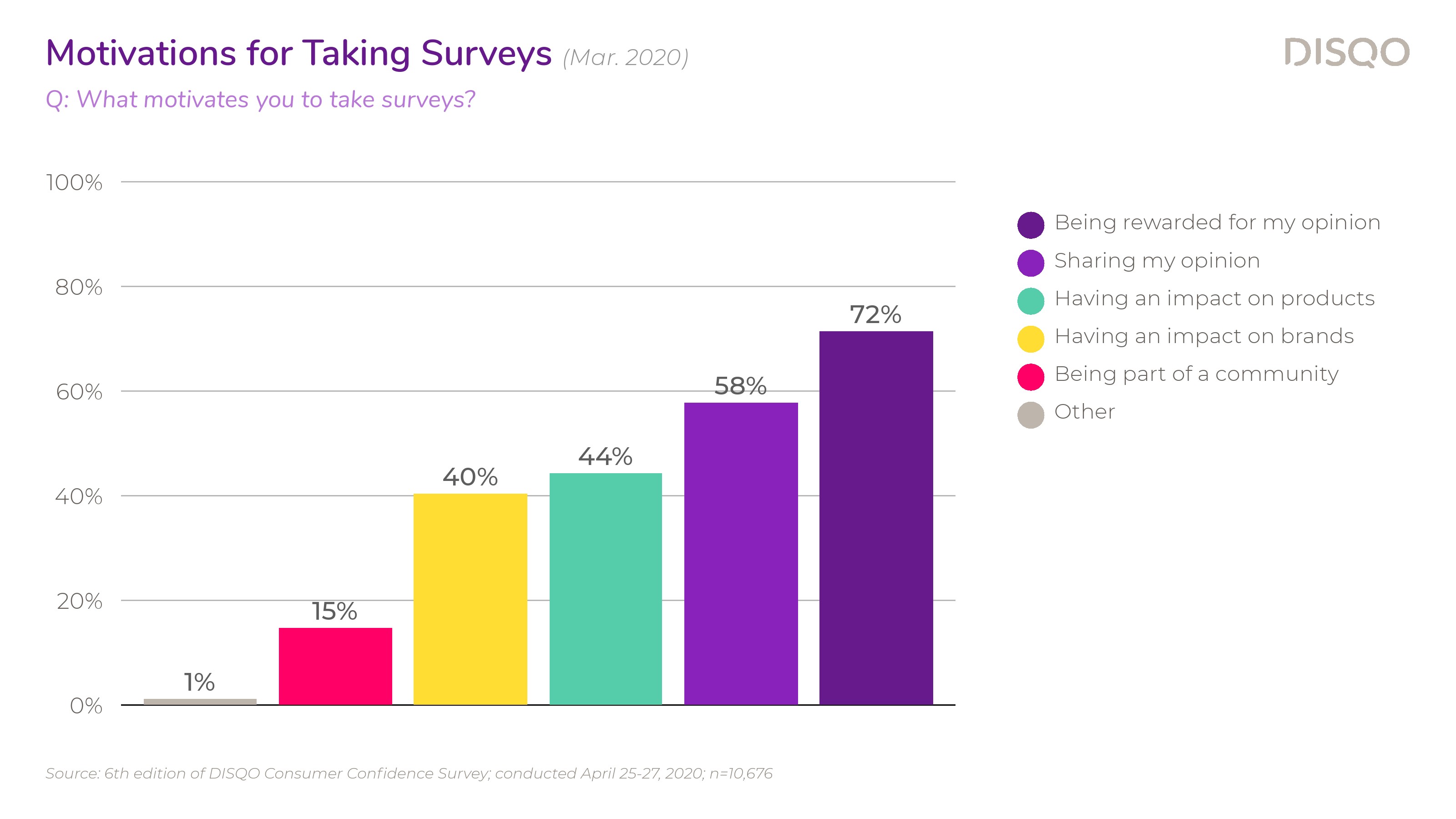 虽然超过一半的受访者(58%)出于分享观点的目的参与调查,但大多数消费者还希望通过调查(72%)获得奖励。其他动机包括对产品产生影响(44%)、对品牌产生影响(40%)和成为社区的一部分(15%)。