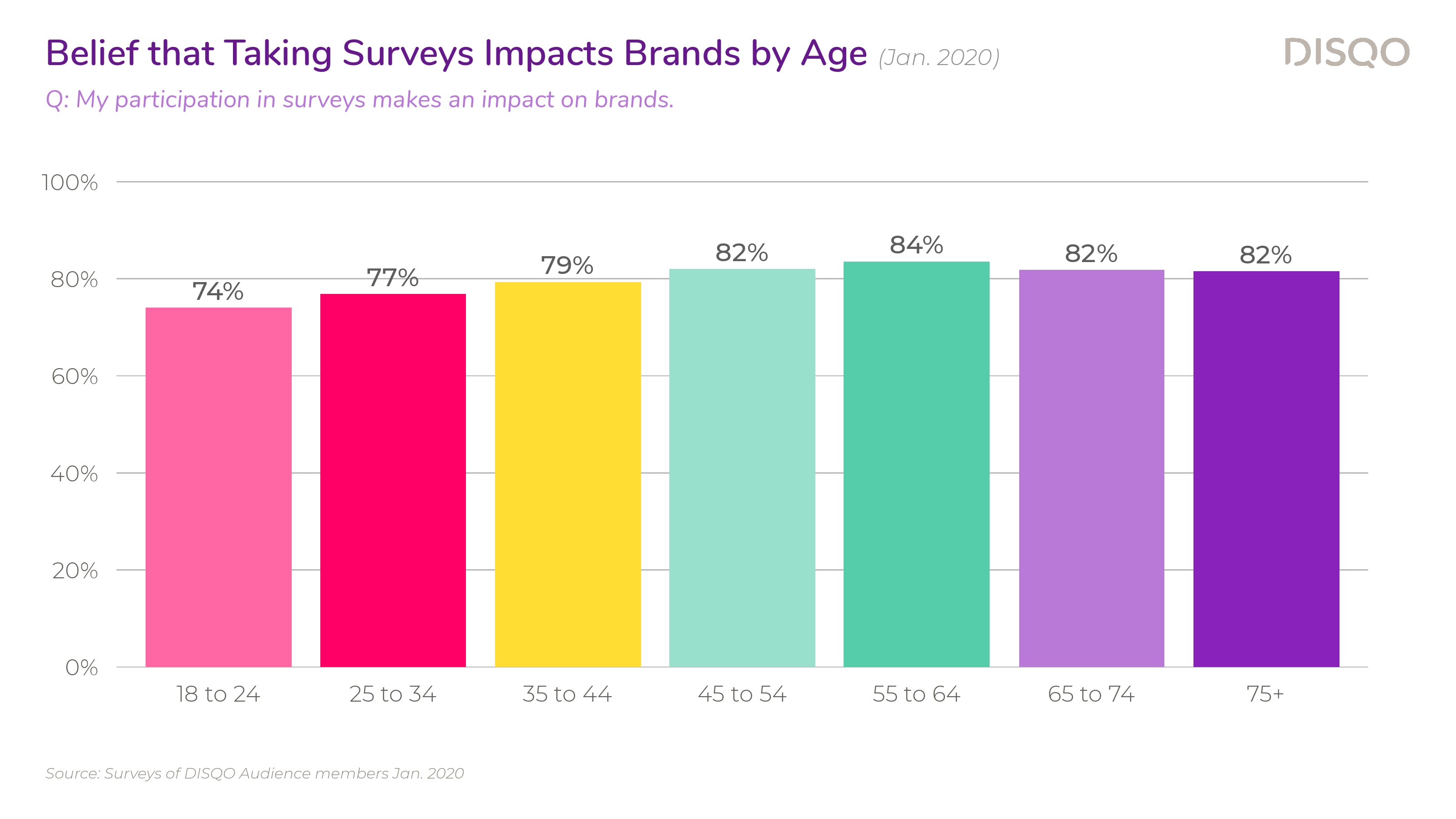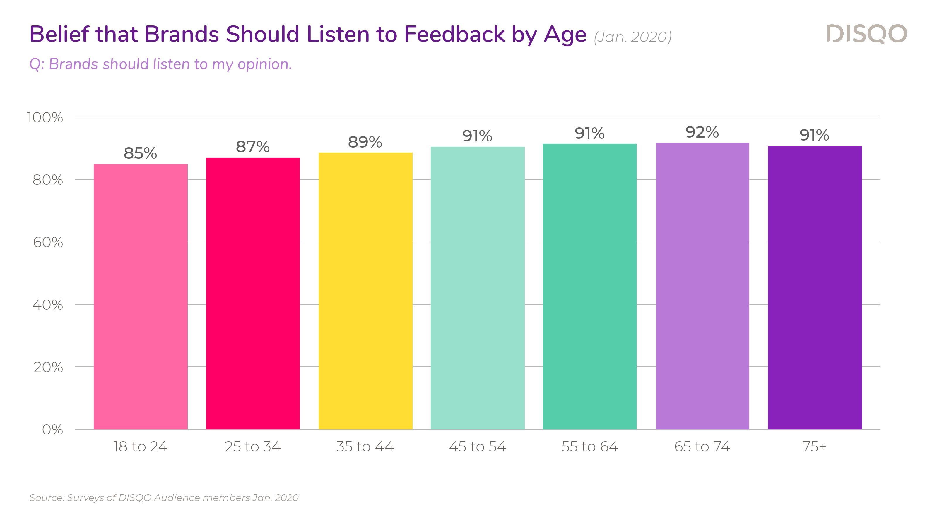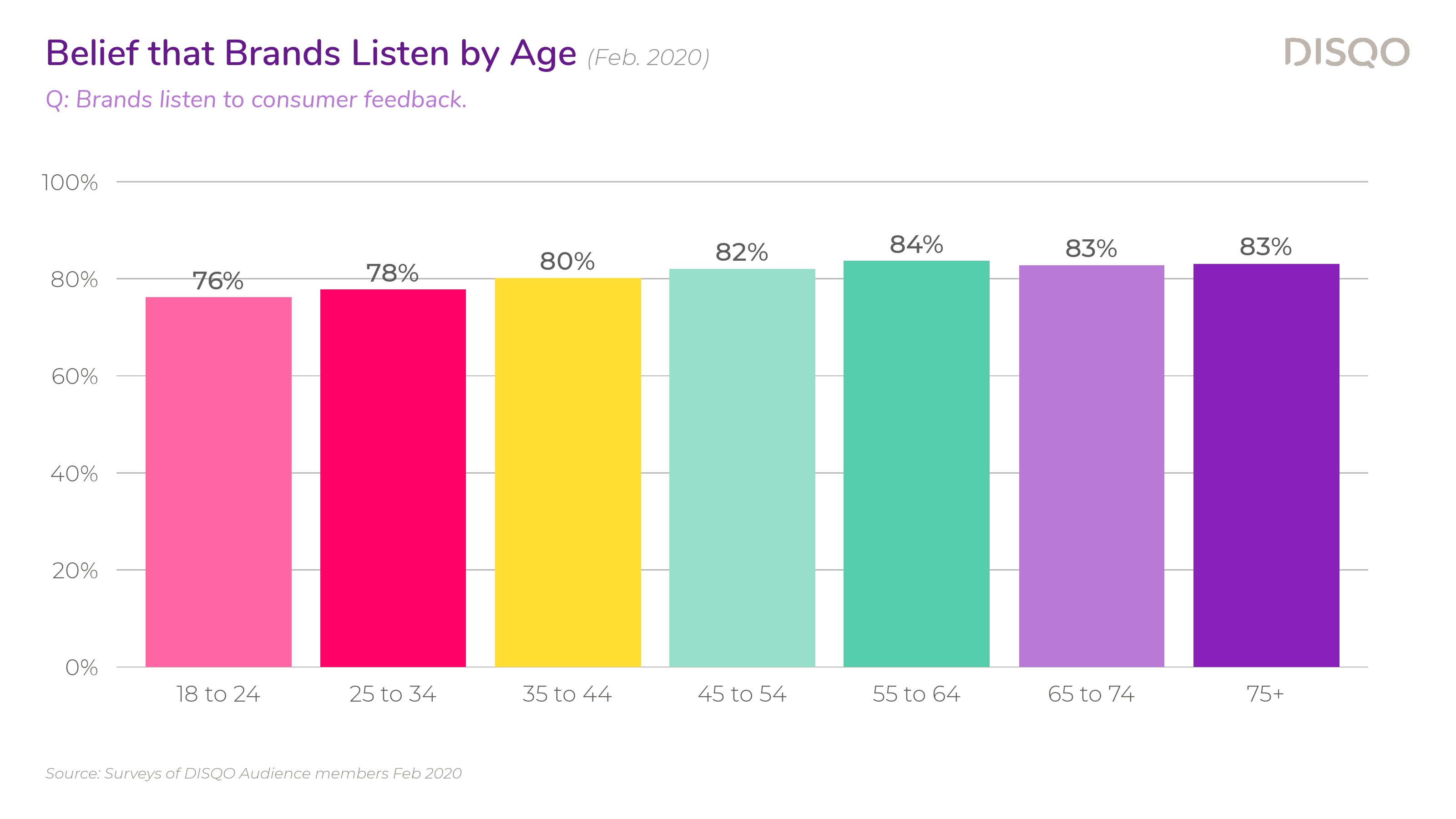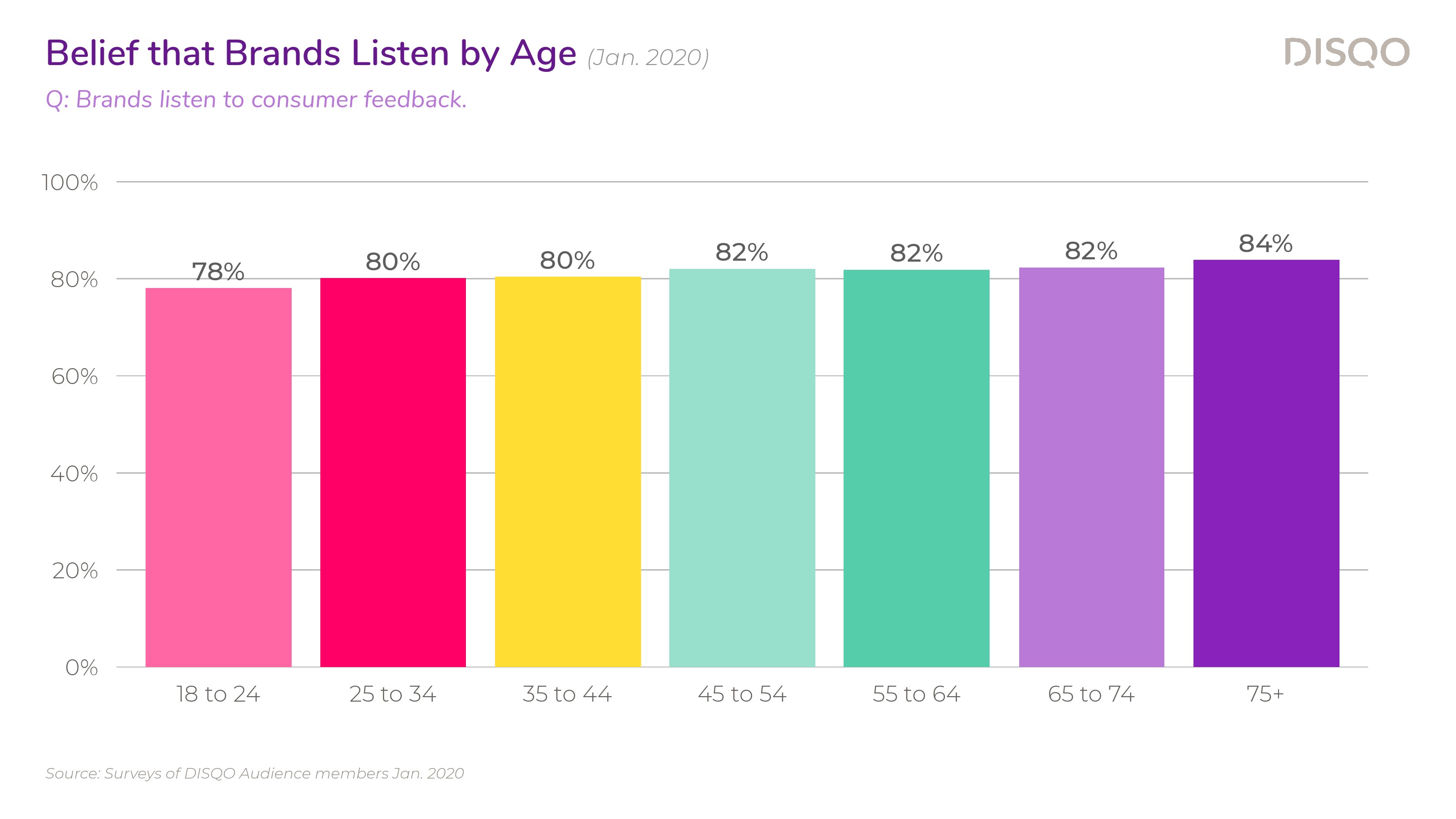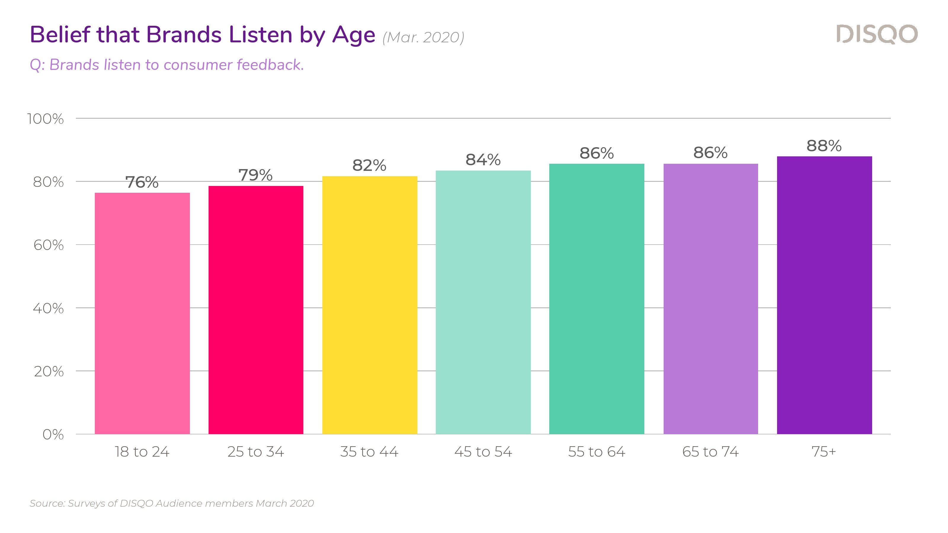 75岁以上的受访者中有88%的人相信品牌会听取消费者的反馈,相比之下,18-24岁群体中这个数字为76%。
