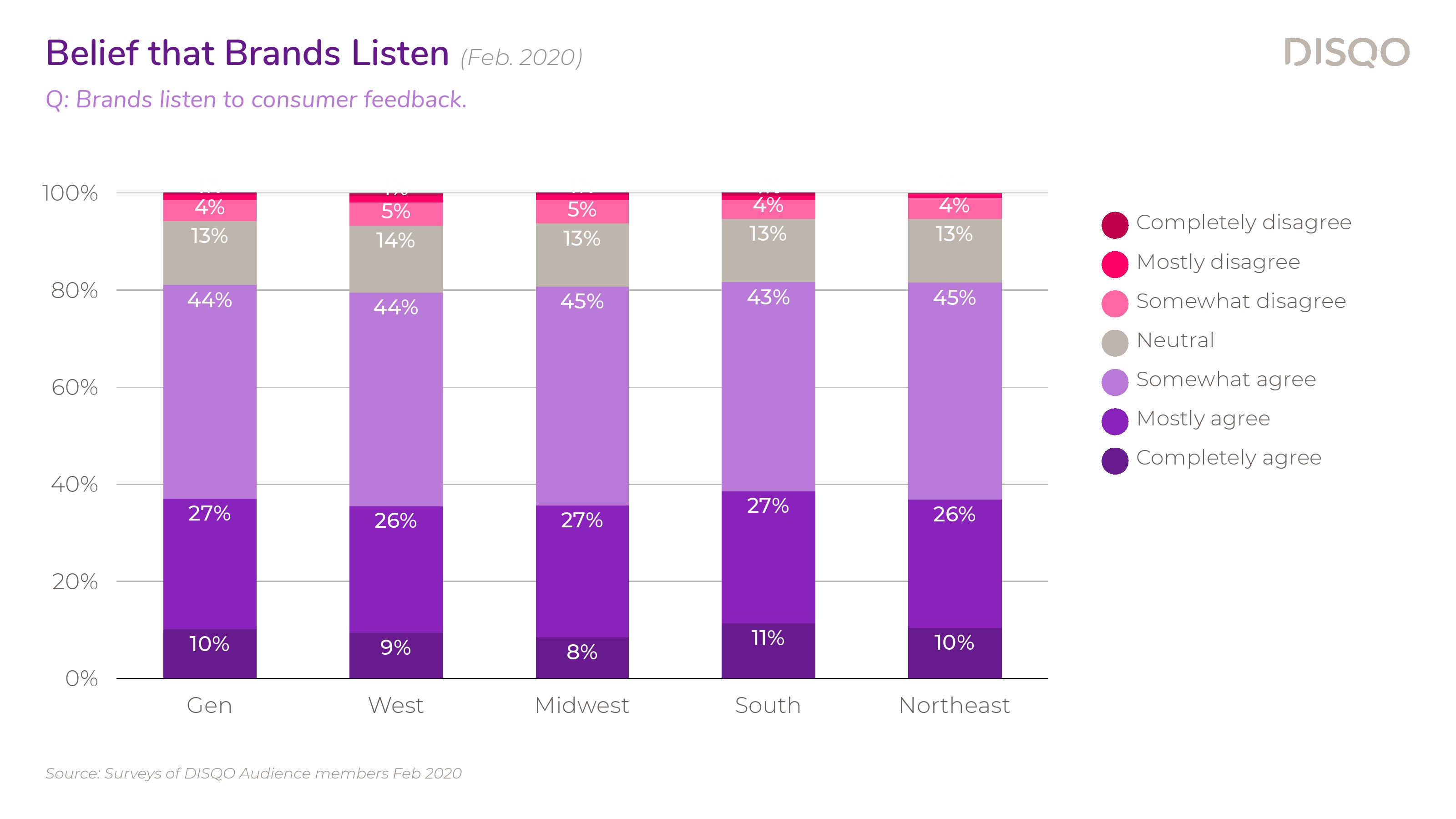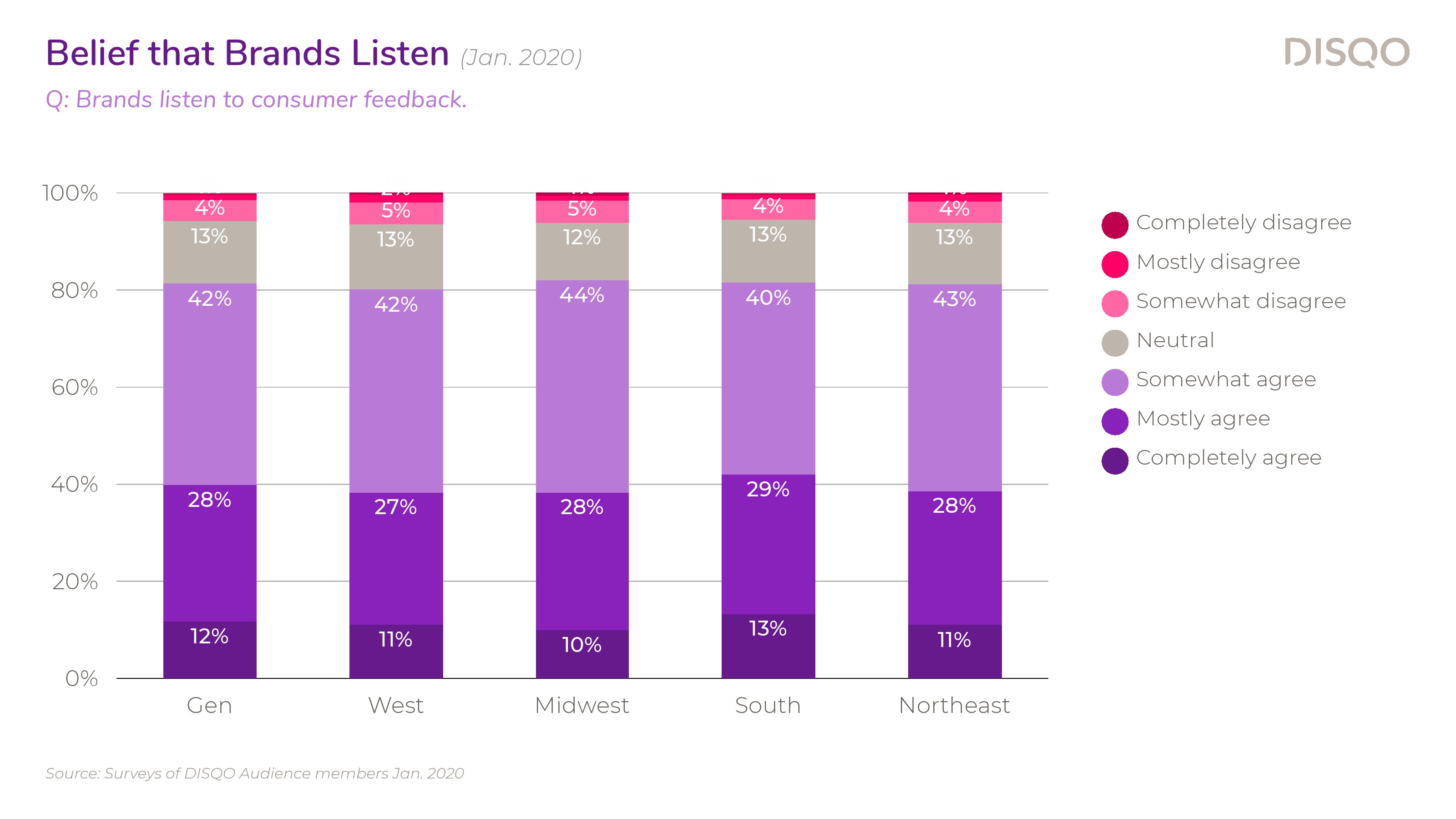 绝大多数受访者(85%)同意品牌确实会听取消费者的反馈,尽管其中一半受访者(43%)只有一定程度的同意这种说法。只有5%的受访者不同意。