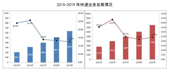 2019年是新中国成立70周年,是决胜全面建成小康社会第一个百年奋斗目标的关键之年。全行业在以习近平同志为核心的党中央坚强领导下,全面贯彻落实中央决策部署,坚持稳中求进工作总基调,坚持以供给侧结构性改革为主线,坚持新发展理念和以人民为中心的发展思想,坚定不移推动邮政业高质量发展,邮政业改革发展取得了新成效,保持了总体平稳、稳中有进的良好态势。全行业业务总量和业务收入分别完成1.6万亿元和9642.5亿元,同比分别增长31.5%和22%,快递业务量突破600亿件。