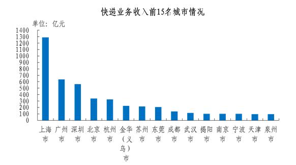 快递业务收入排名前十五位的城市依次是上海、广州、深圳、北京、杭州、金华(义乌)、苏州、东莞、成都、武汉、揭阳、南京、宁波、天津、泉州,其快递业务收入合计占全部快递业务收入的比重达到60.7%。