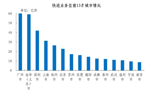 快递业务量排名前十五位的城市依次是广州、金华(义乌)、深圳、上海、杭州、北京、苏州、东莞、揭阳、成都、泉州、武汉、温州、宁波和南京,其快递业务量合计占全部快递业务量的比重达到56.5%。