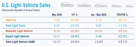 6月5日,据NADA首席经济学家Patrick Manzi的分析和报,美国5月份的新轻型汽车销售显示出复苏的迹象,SAAR为1,221万辆。尽管与2019年5月相比下降了29.8%,但与上个月的47.9%的下降相比有明显改善。4月份似乎是新车销售低迷的底部,但是因为许多州和地方政府放松或终止了在家隔离的政策,整个5月份的销售状况有所改善。在四月份首次超过整个汽车细分市场之后,五月份的皮卡车仍然很受欢迎,但在汽车细分市场上却表现不佳。,整个轻型卡车市场(跨界车,皮卡和SUV)在5月份仍然保持强劲,占总销售额的创纪录的77.2%。到2020年,到目前为止,轻型卡车占新车销量的四分之三。