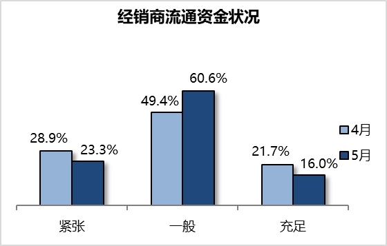 调查显示,经销商认为5月流动资金状况一般。经销商认为紧张的比例为23.3%,一般的为60.6%,充足的为16.0%。