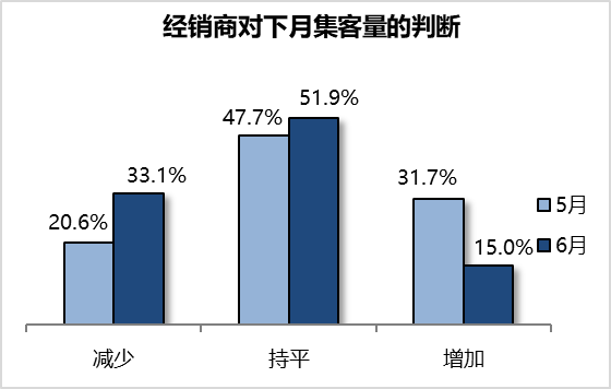 调查显示,经销商认为6月集客量减少。经销商认为减少的比例为33.1%,持平的为51.9%,增加的为15.0%。