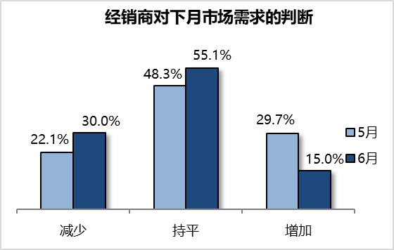 调查显示,经销商认为6月市场总需求减少。经销商认为减少的比例为30.0%,持平的为55.1%,增加的为15.0%。