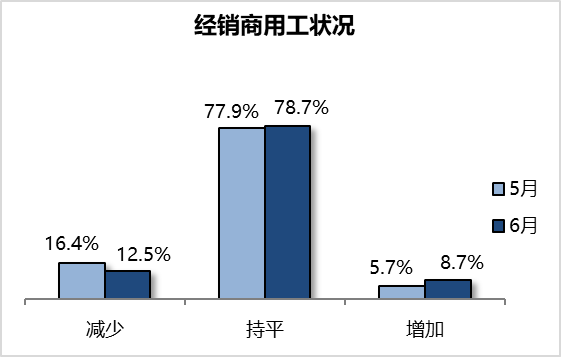 调查显示,经销商预计6月人数持平。经销商认为减少的比例为12.5%,持平的为78.7%,增长的为8.7%。