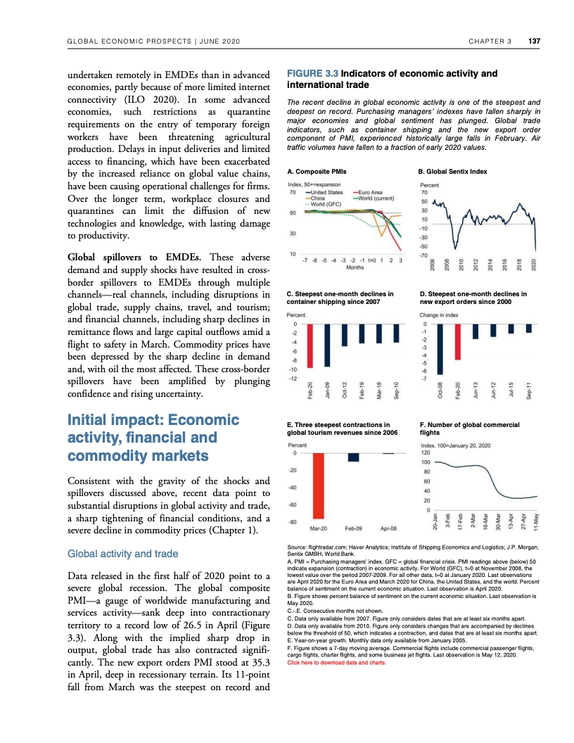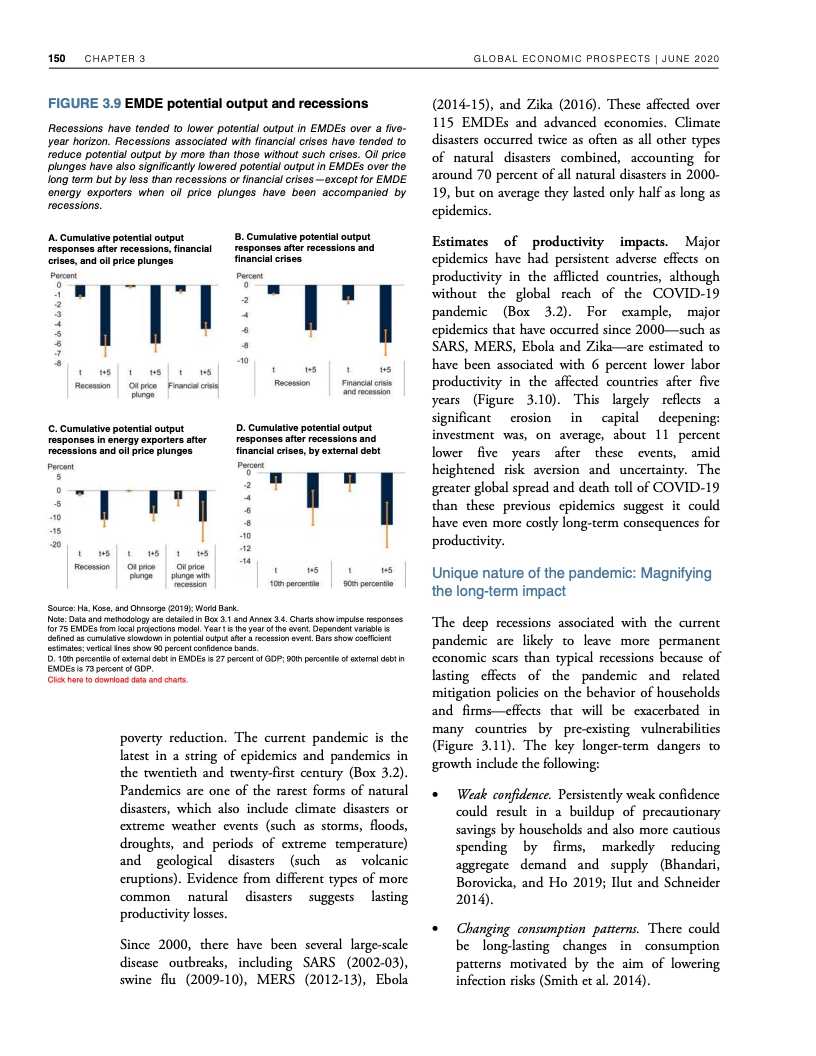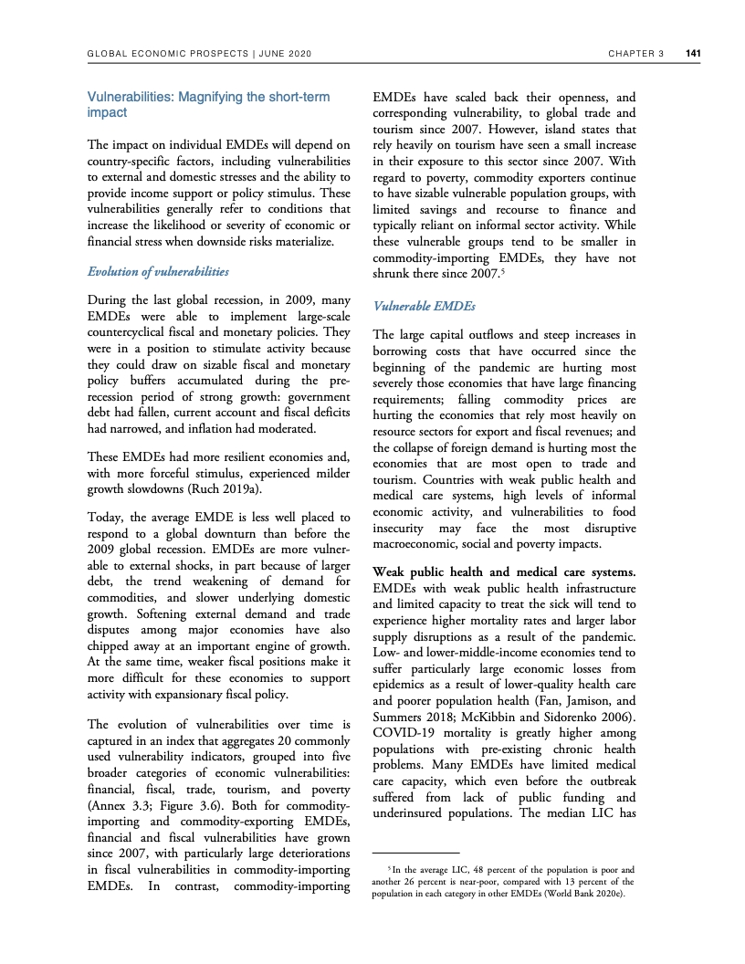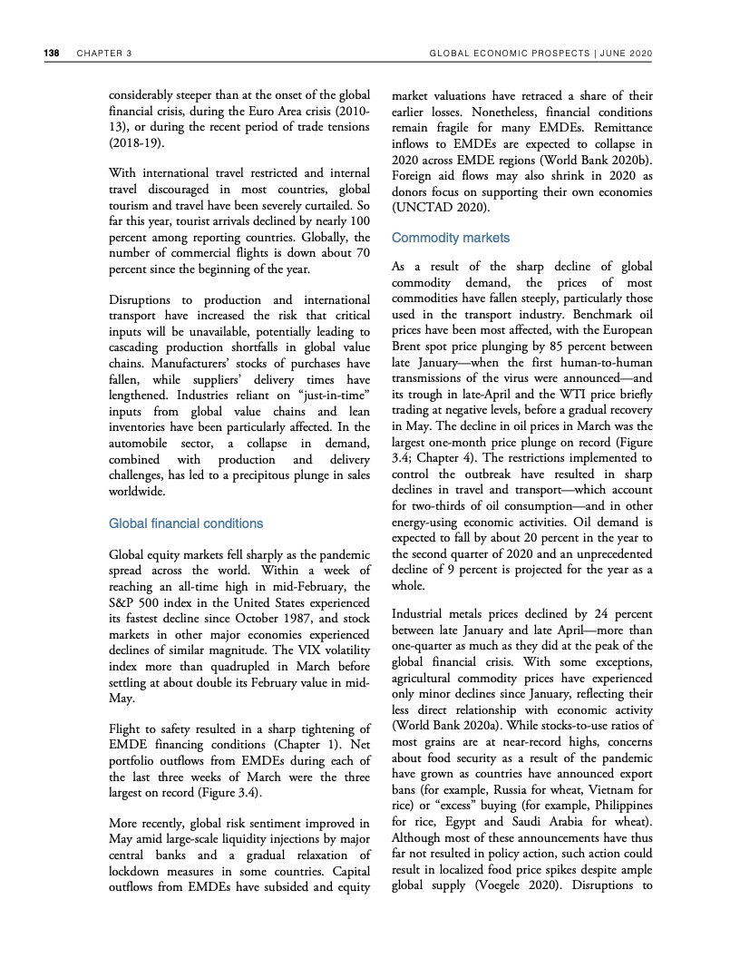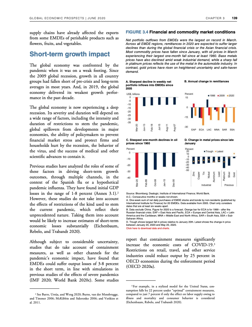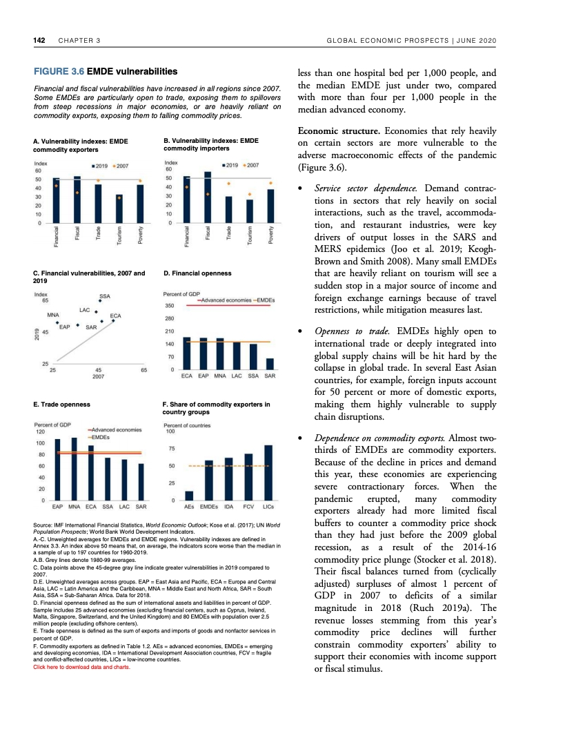 报告认为,由于新冠疫情的冲击及其防控措施带来的经济“停摆”,全球经济将在2020年陷入严重收缩,预计人均收入降低3.6%。今年将是1870年以来人均产出出现下降的经济体数量最多的一年。其中,严重依赖全球贸易、旅游、大宗商品出口和外部融资的经济体受疫情冲击最大。此外,新兴市场及发展中经济体的脆弱性也将被外来冲击放大。