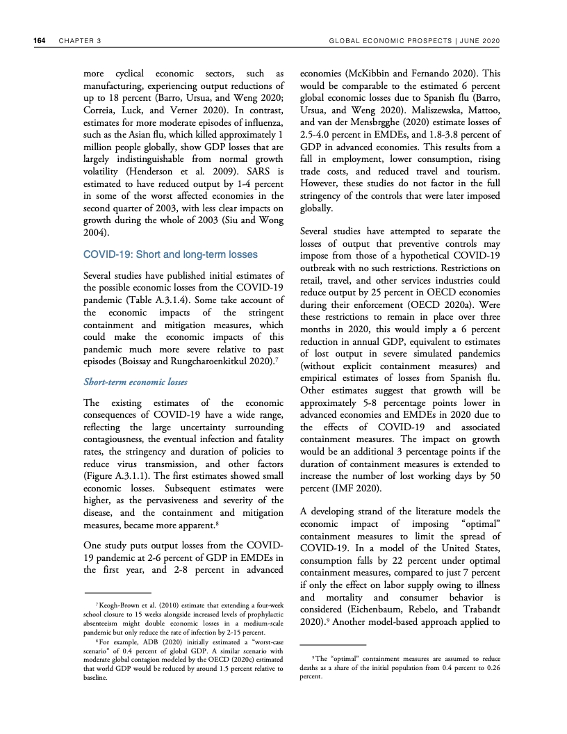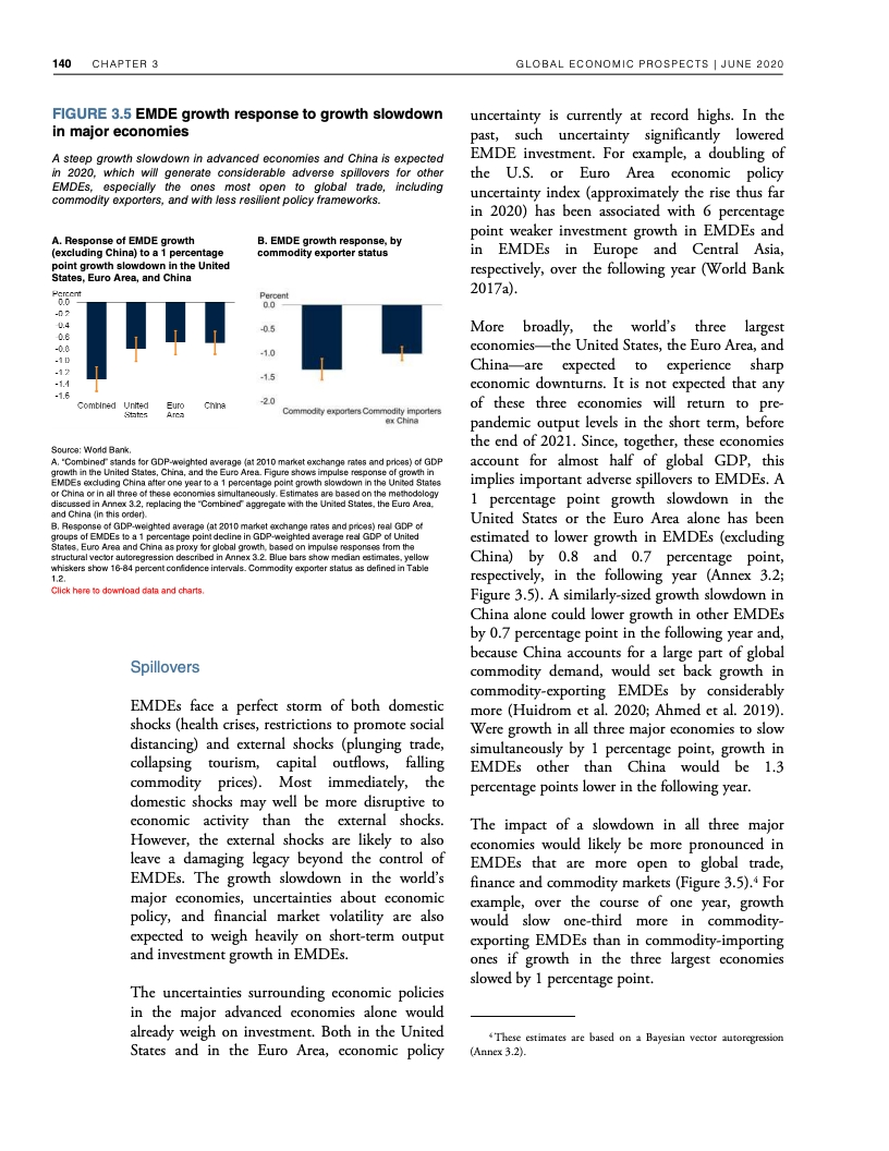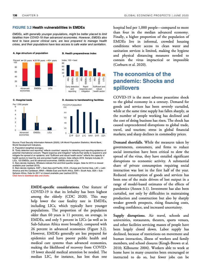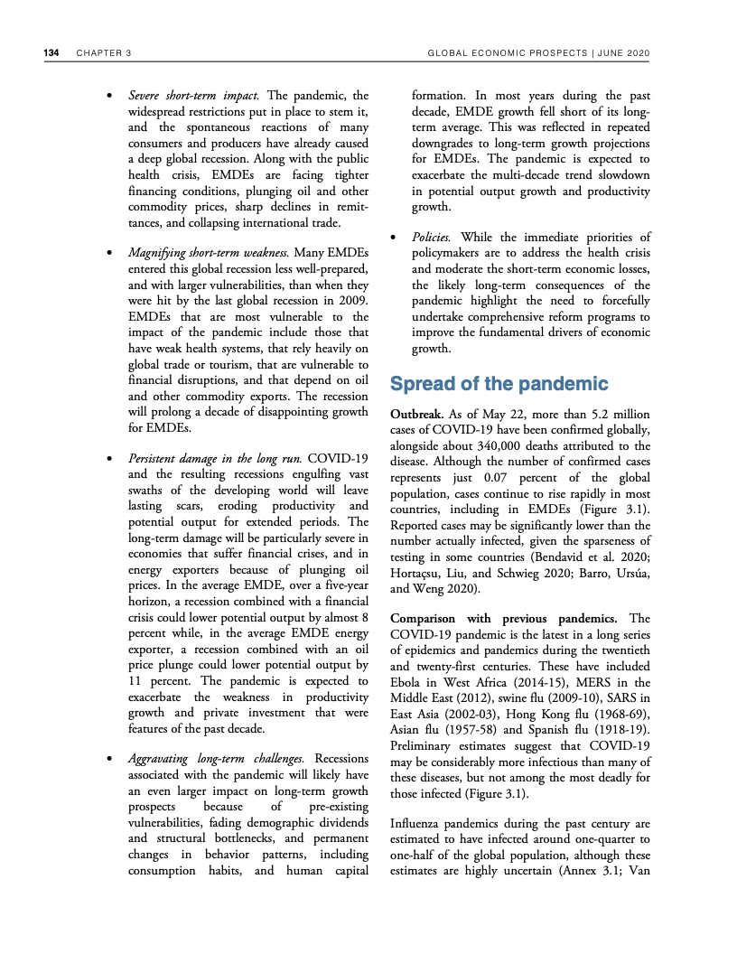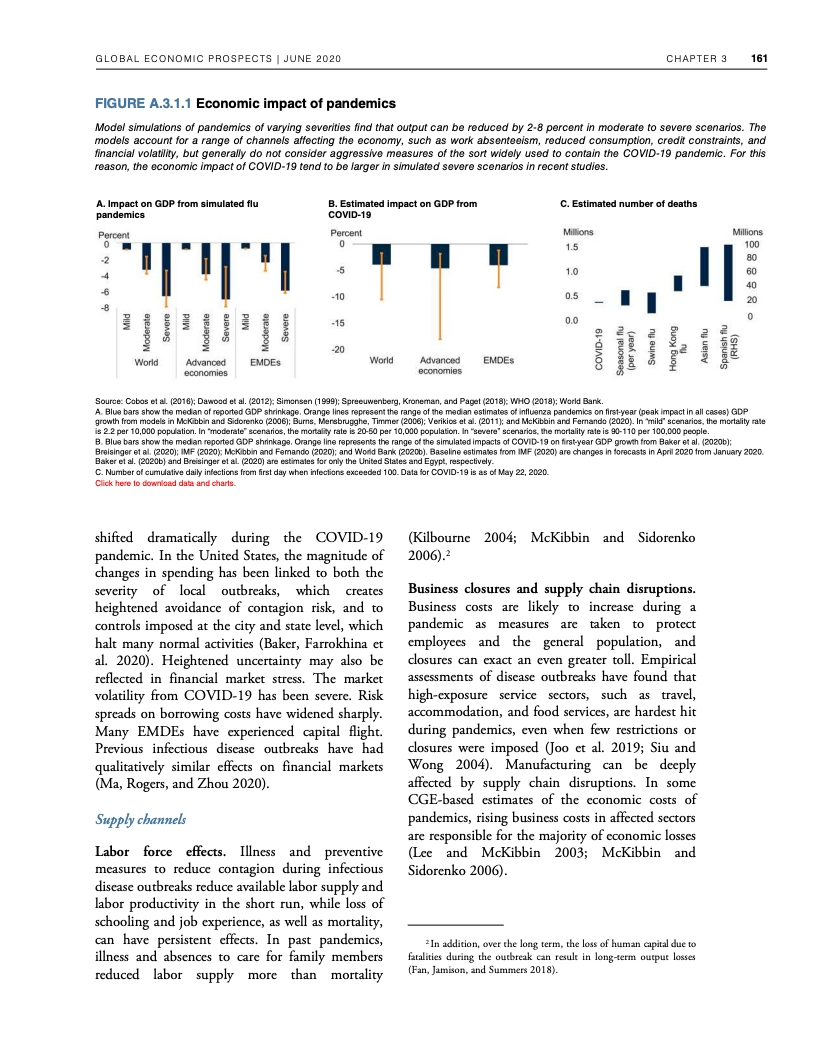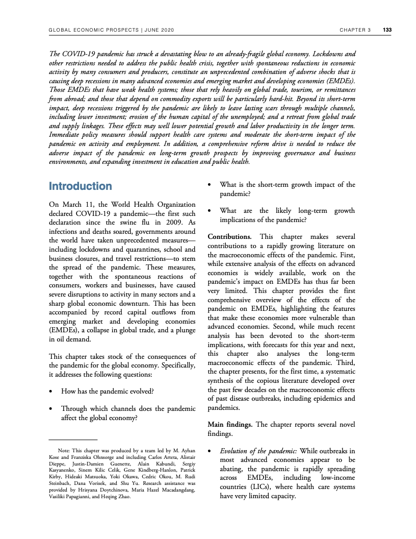 报告认为,由于新冠疫情的冲击及其防控措施带来的经济“停摆”,全球经济将在2020年陷入严重收缩,预计人均收入降低3.6%。今年将是1870年以来人均产出出现下降的经济体数量最多的一年。其中,严重依赖全球贸易、旅游、大宗商品出口和外部融资的经济体受疫情冲击最大。此外,新兴市场及发展中经济体的脆弱性也将被外来冲击放大。