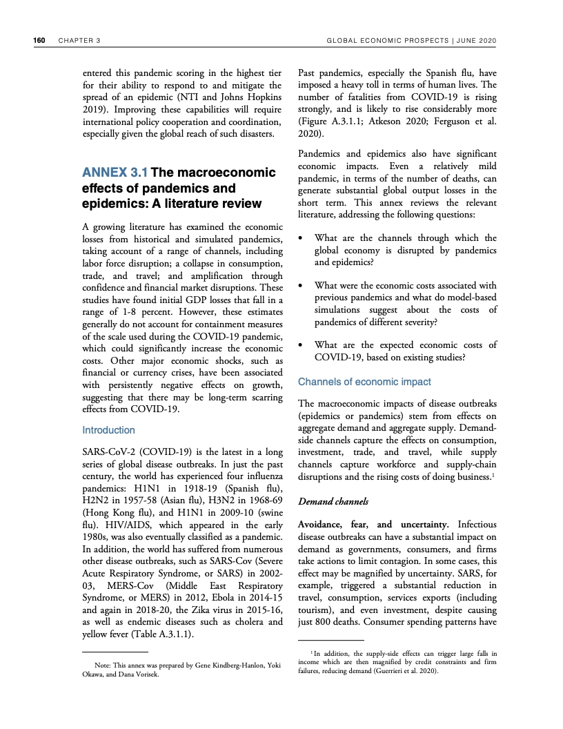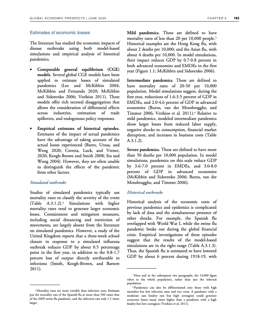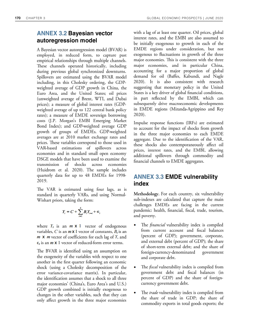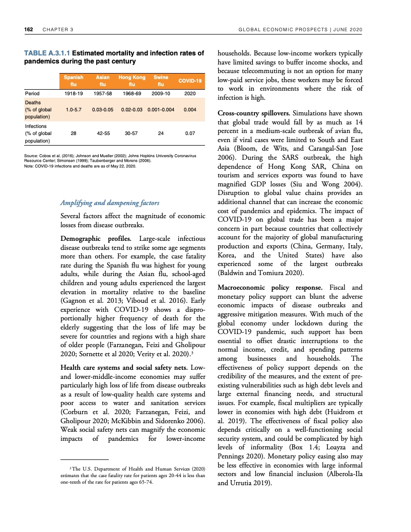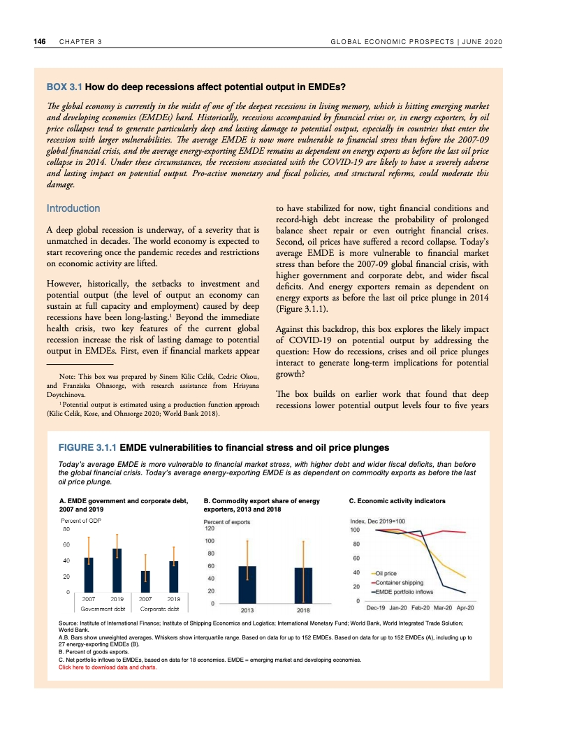 报告认为,由于新冠疫情的冲击及其防控措施带来的经济“停摆”,全球经济将在2020年陷入严重收缩,预计人均收入降低3.6%。今年将是1870年以来人均产出出现下降的经济体数量最多的一年。其中,严重依赖全球贸易、旅游、大宗商品出口和外部融资的经济体受疫情冲击最大。此外,新兴市场及发展中经济体的脆弱性也将被外来冲击放大。