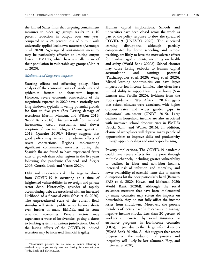报告援引世界银行副行长杰伊拉·帕扎尔巴舍奥卢的话说,这一不利经济前景发人深省,新冠危机可能留下永久“伤疤”,构成重大全球性挑战。眼下,全球面对的首要任务是应对卫生和经济紧急状况。此后,国际社会必须团结起来,促进经济复苏,以防更多人陷入贫困和失业。