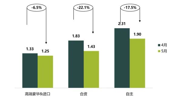 高端豪华&进口品牌、合资品牌及自主品牌库存系数环比下降。高端豪华&进口品牌库存系数为1.25,环比下降6.5%;合资品牌库存系数为1.43,环比下降22.1%;自主品牌库存系数为1.90,环比下降17.5%。