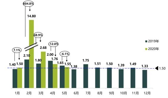 2020年6月10日,中国汽车流通协会发布2020年5月份“汽车经销商库存”调查结果:5月份汽车经销商综合库存系数为1.55,同比下降6.1%,环比下降11.9%,库存水平位于警戒线以上。