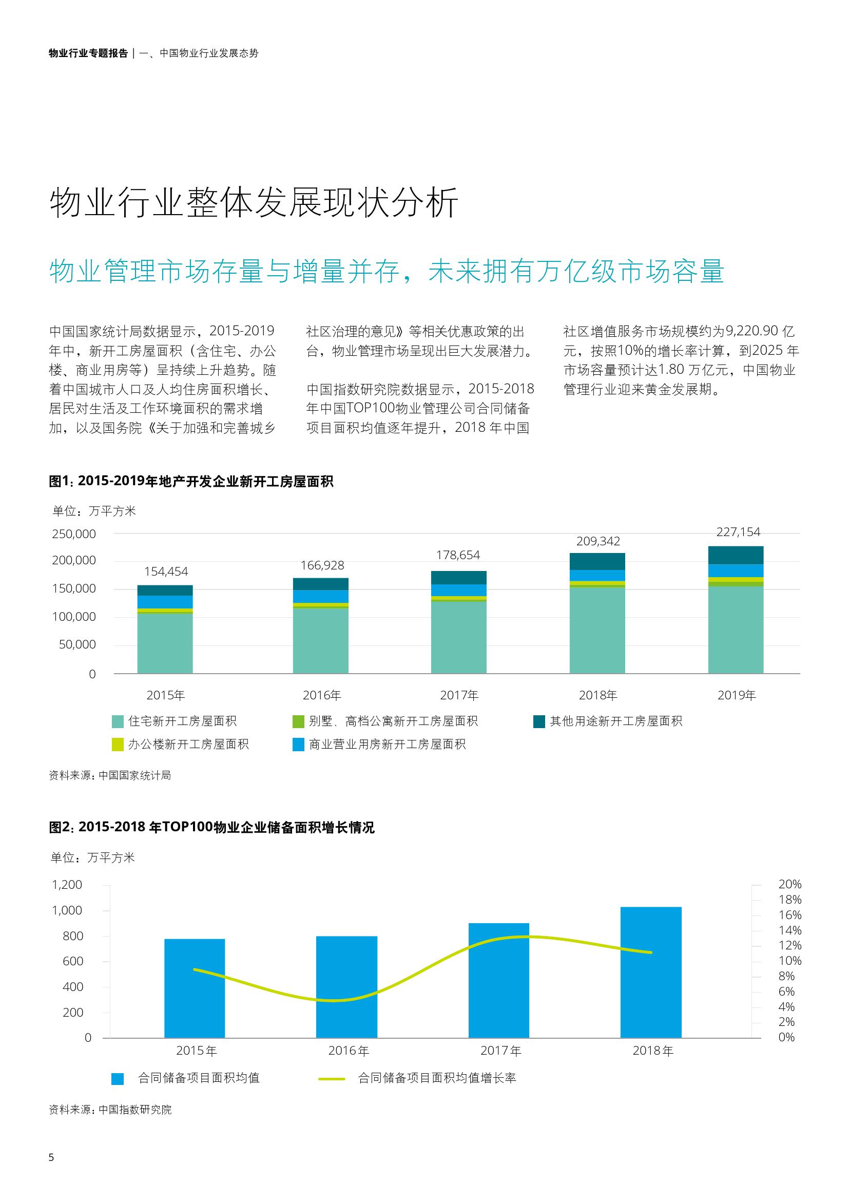 随着中国城市人口及人均住房面积增长、居民对生活及工作环境面积的需求增加,以及国务院《关于加强和完善城乡社区治理的意见》等相关优惠政策的出台,物业管理市场呈现出巨大发展潜力,存量与增量并存,未来或将拥有万亿级市场容量。