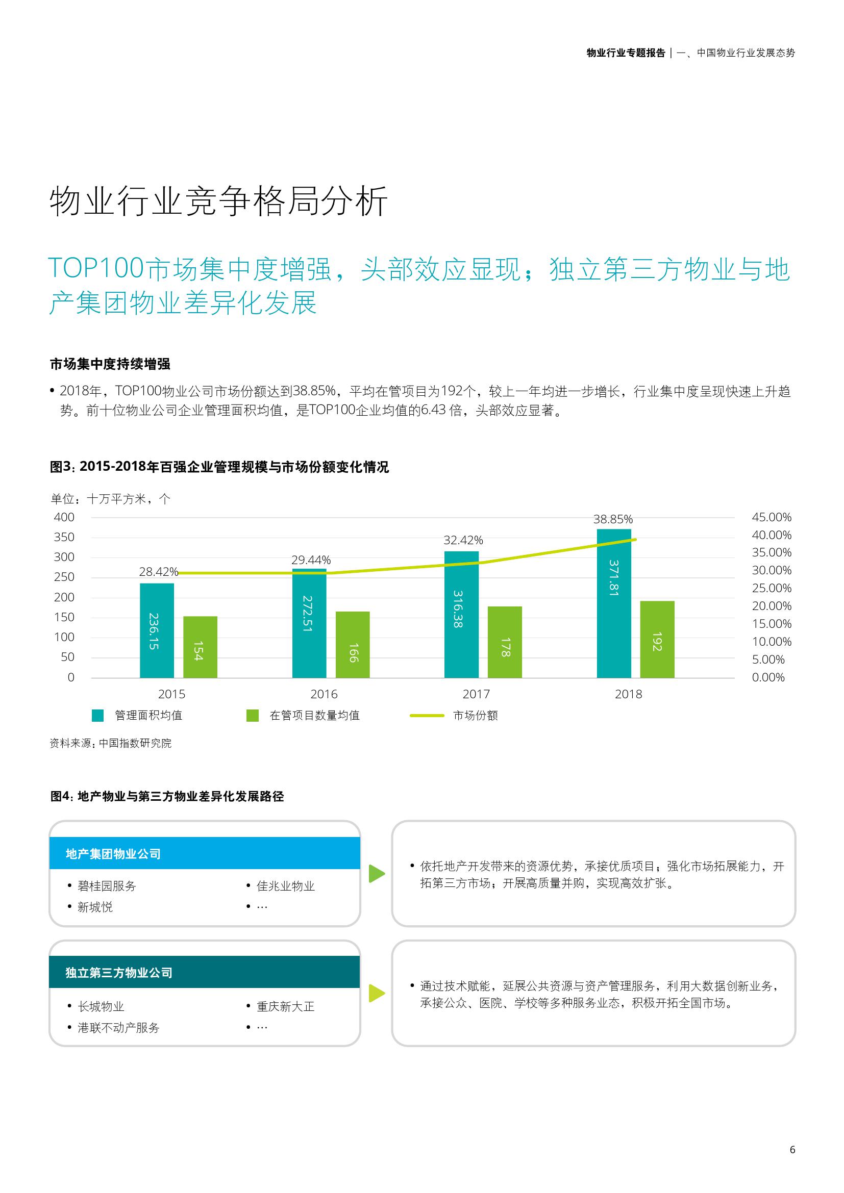 从物业行业竞争格局来看,2018年,TOP100物业公司市场份额达到38.85%,较上一年均进一步增长,行业集中度呈现快速上升趋势。前十位物业公司企业管理面积均值,是TOP100企业均值的6.43 倍,头部效应显著;同时,独立第三方物业与地产集团物业分别秉持差异化的发展路径。