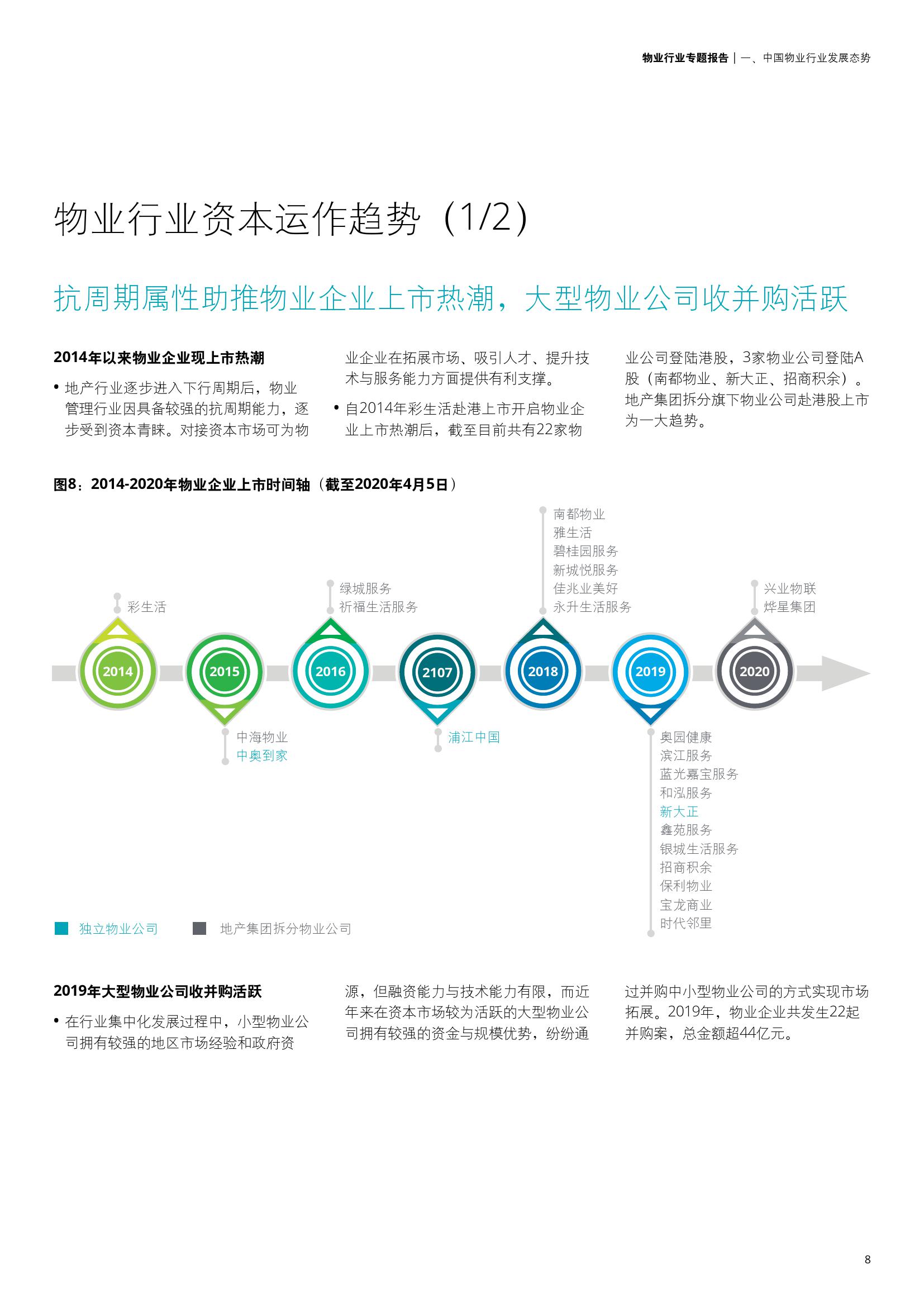 在资本运作方面,物业管理企业由于其具备较强的抗周期属性,逐步受到资本青睐,呈现上市与收并购热潮。2014年以来,共有22家物业公司登陆港股,3家物业公司登陆A股,地产集团拆分旗下物业公司赴港股上市为一大趋势;2019年,物业企业共发生22起并购案,总金额超44亿元。