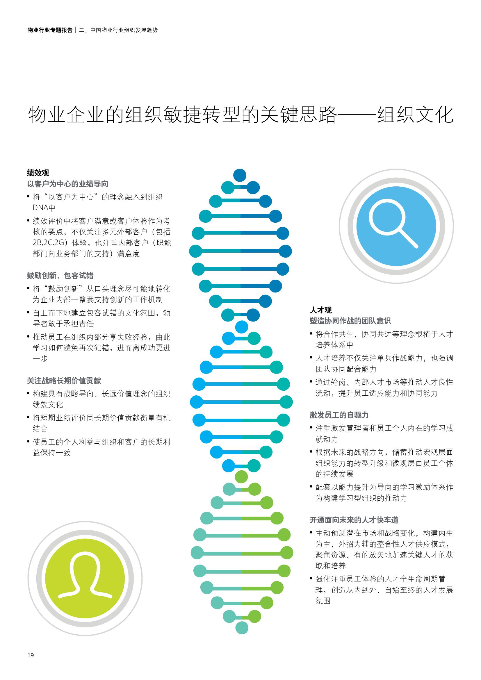 为充分激活组织,快速构建适应未来发展的组织能力,德勤咨询认为物业管理企业需要在组织中植入驾驭数字化变革的敏捷组织基因,包括客户中心、敏捷灵活、高效协同、持续创新、开放共享和技术卓越,这些组织能力过去往往被人们认为是互联网公司才需要具备的。基于调研分析和项目实践,德勤咨询将从组织架构、组织治理及组织文化三个方面,总结物业行业组织敏捷转型的关键思路。