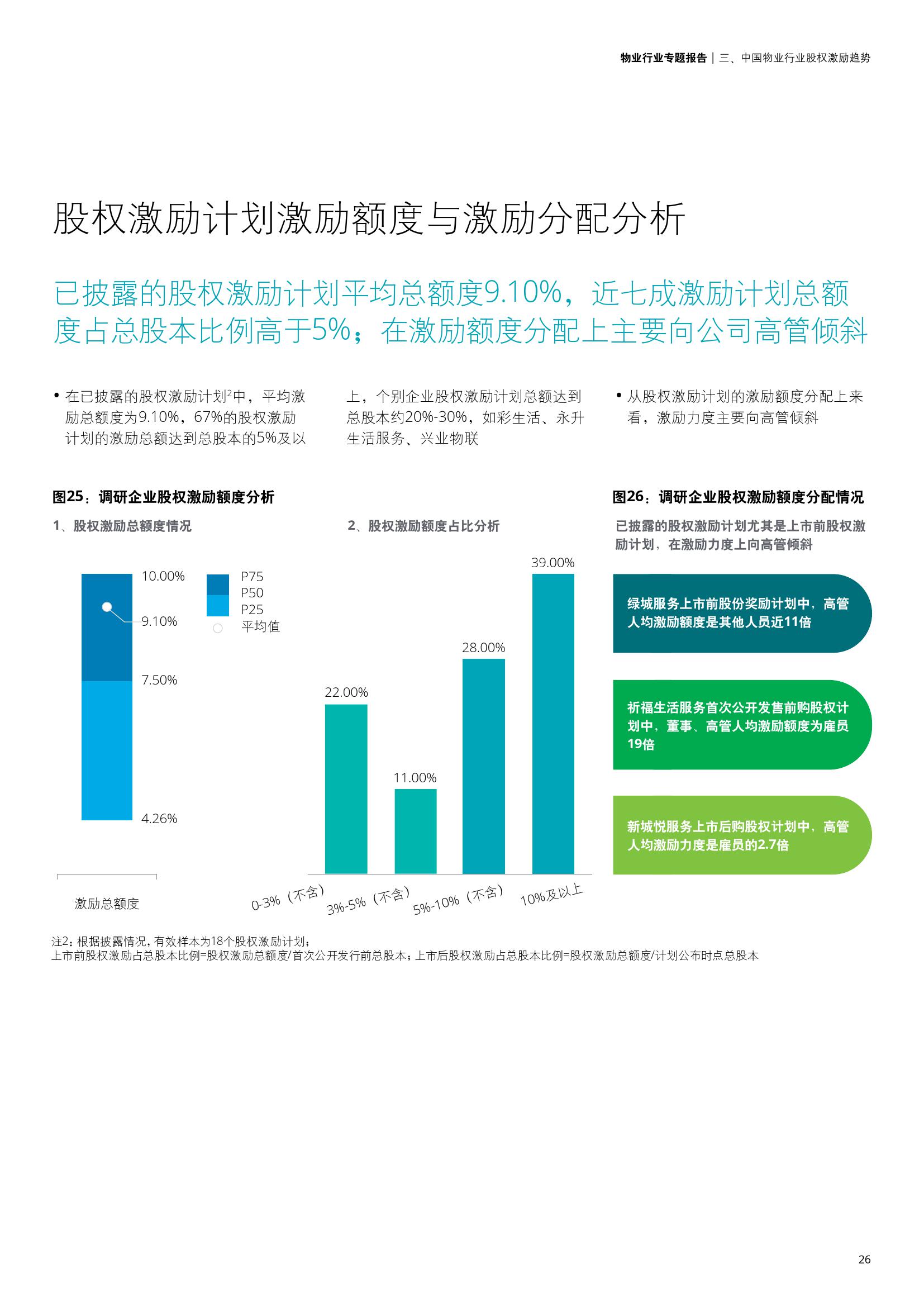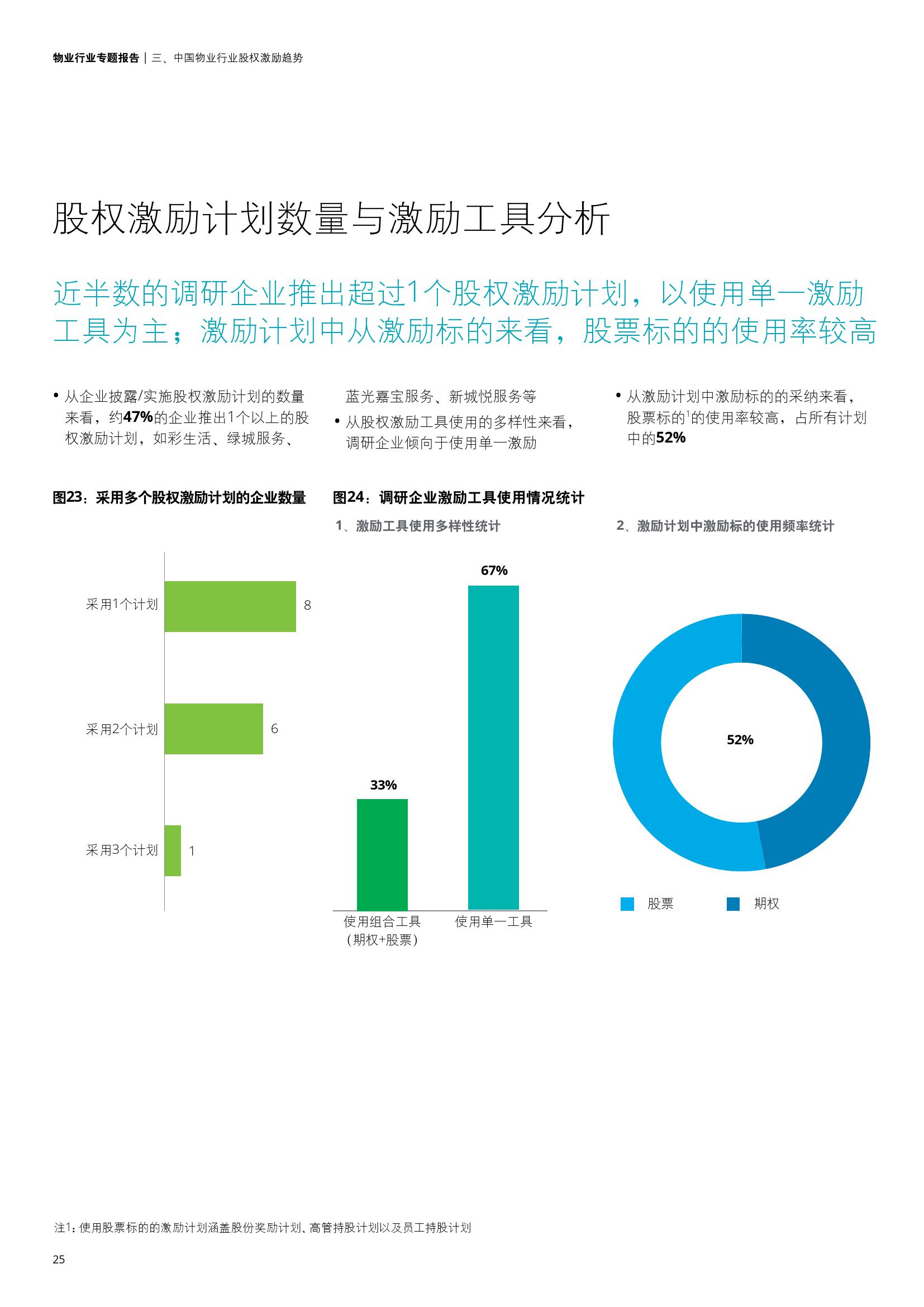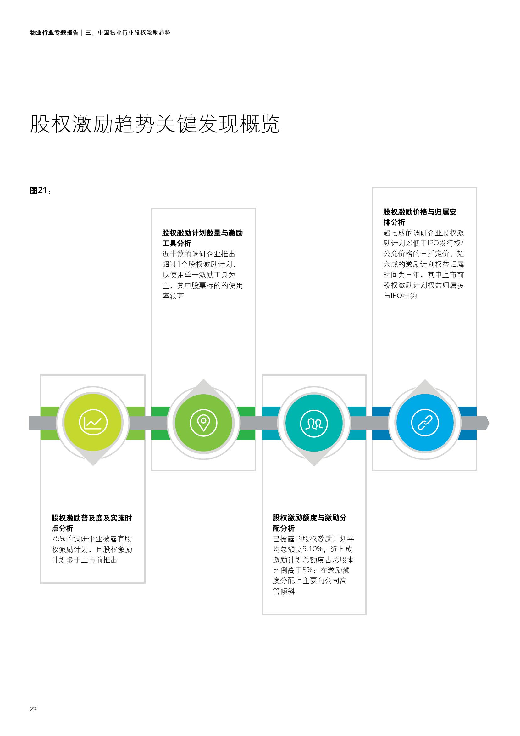 同时,本报告对调研物业管理企业股权激励计划的普及度、实施时点、计划数量、激励工具、激励额度、激励分配、激励价格以及归属安排进行趋势分析,以期为物业管理企业探索股权激励机制提供参考。