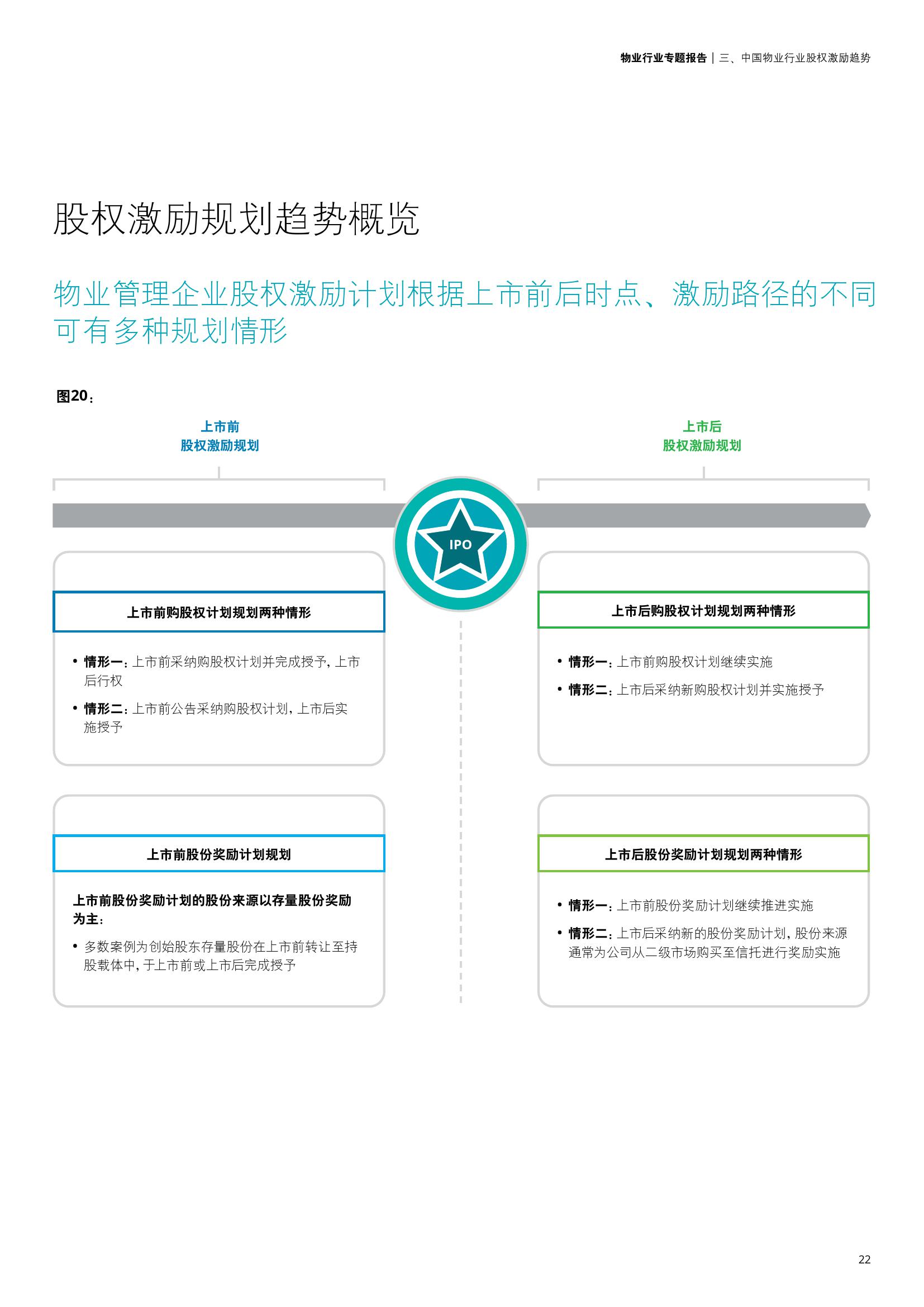 针对本报告选取的20家由境内地产集团拆分出的赴香港上市的物业管理企业,就其股权激励机制进行深入解读后发现,物业管理企业股权激励计划根据上市前后时点、激励路径的不同可有多种规划情形。