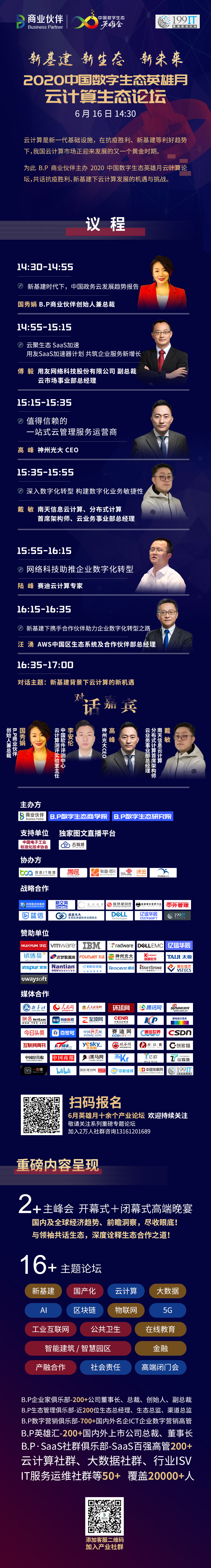 云计算是新一代基础设施,在抗疫胜利、新基建等利好趋势下,我国云计算市场正迎来发展的又一个黄金时期。为此B.P商业伙伴主办2020中国数字生态英雄之云计算生态合作专题线上论坛,共话抗疫胜利、新基建叠加下云计算发展的机遇与挑战。