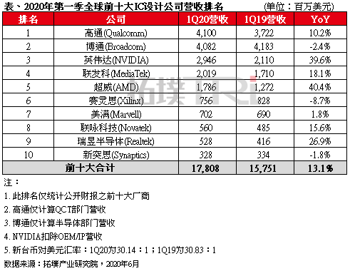 根据集邦咨询旗下拓墣产业研究院最新统计,全球前十大IC设计业者2020年第一季营收及排名出炉,高通(Qualcomm)受惠于5G产品策略奏效,以及疫情催生的远程办公与教学需求大幅成长,营收摆脱连续六季年衰退的态势;博通(Broadcom)半导体部门则因为市场竞争与中美贸易战的影响,营收呈现连续五季的负成长,使得一、二名排名易位。