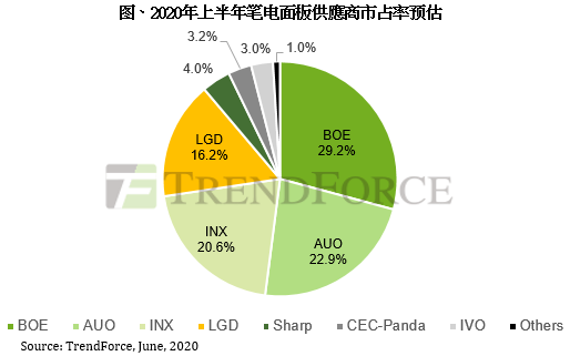 今年笔电面板供应版图与去年并无太大差异,上半年出货排名前四大依旧是京东方、友达、群创与乐金显示(LGD),前四大的市占率近9成。集邦咨询指出,笔电面板的供应相对其他应用别来说明显集中,新供应商对市场的干扰较少,加上疫情催化的需求推升第二季笔电面板价格呈现上涨。值得注意的是,教育用与在家工作的笔电大多搭载较低阶的TN面板,并非消费性市场较常见的IPS面板,TN面板的主要供应商如京东方、友达与群创的价格策略也因此着重在上调TN产品价格以拉高产品毛利。