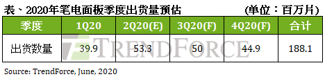 集邦咨询分析师杨晴翔指出,受惠于在家工作与远距教学的笔电需求,上半年笔电面板出货淡季不淡,而且目前面板厂也乐观预估需求有望延续至第三季。全球疫情状况预期在下半年逐渐趋缓,随之而来的笔电需求红利也可能退烧;但随着各国终端市场解禁,笔电品牌的销售重心也会从商用与公用需求转回消费性市场,品牌通路的库存回补需求预期能将笔电面板行情延展至第三季。但后疫情时期消费者预算支出减少,终端产品的销售表现仍将是影响第四季笔电面板走势的关键。