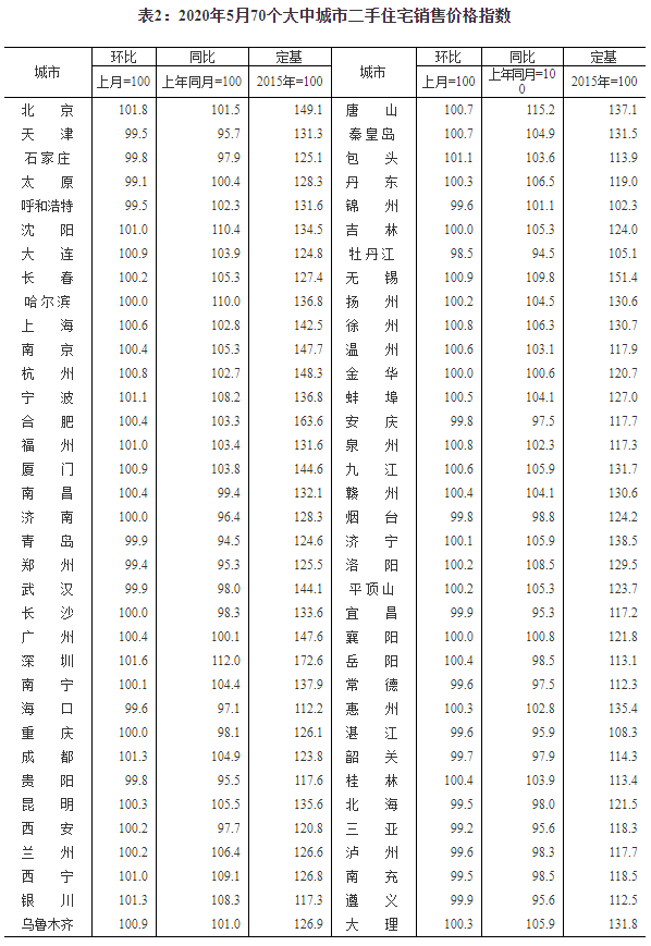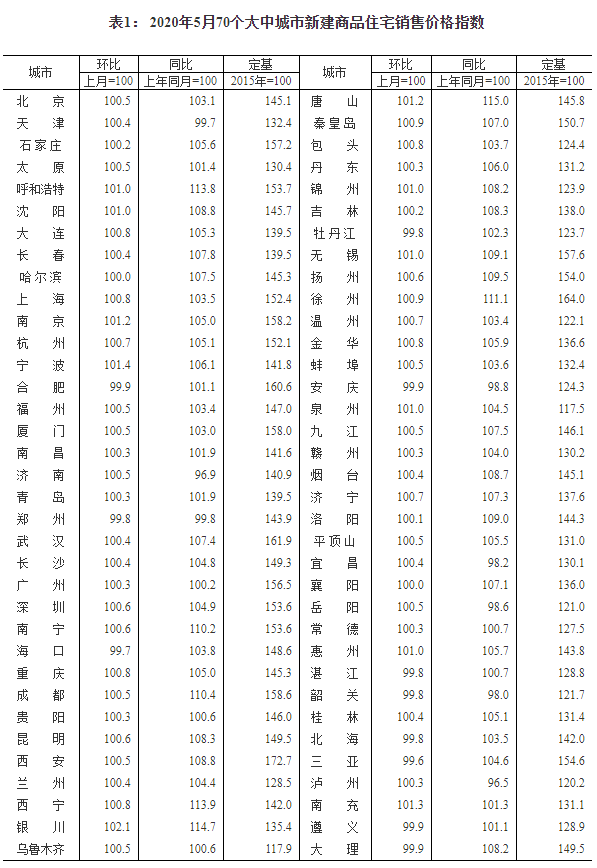 国家统计局:2020年5月70个大中城市新建商品住宅销售价格指数