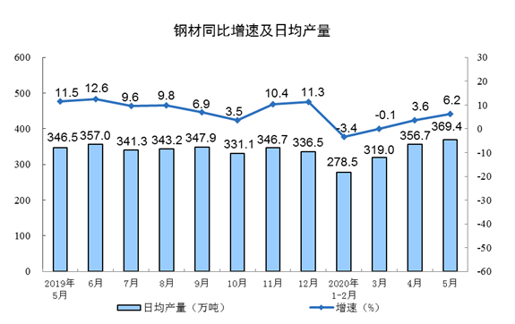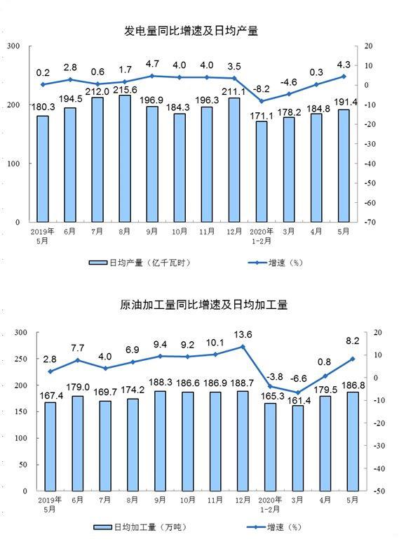 分产品看,5 月份,612 种产品中有 344 种产品同比增长。钢材 11453 万吨,同比增长 6.2%;水泥 24869 万吨,增长 8.6%;十种有色金属 498 万吨,增长 4.1%;乙烯 168 万吨,下降 2.7%;汽车 215.2 万辆,增长 19.0%,其中,新能源汽车 8.5 万辆,下降 22.0%;发电量 5932 亿千瓦时,增长 4.3%;原油加工量 5790 万吨,增长 8.2%。