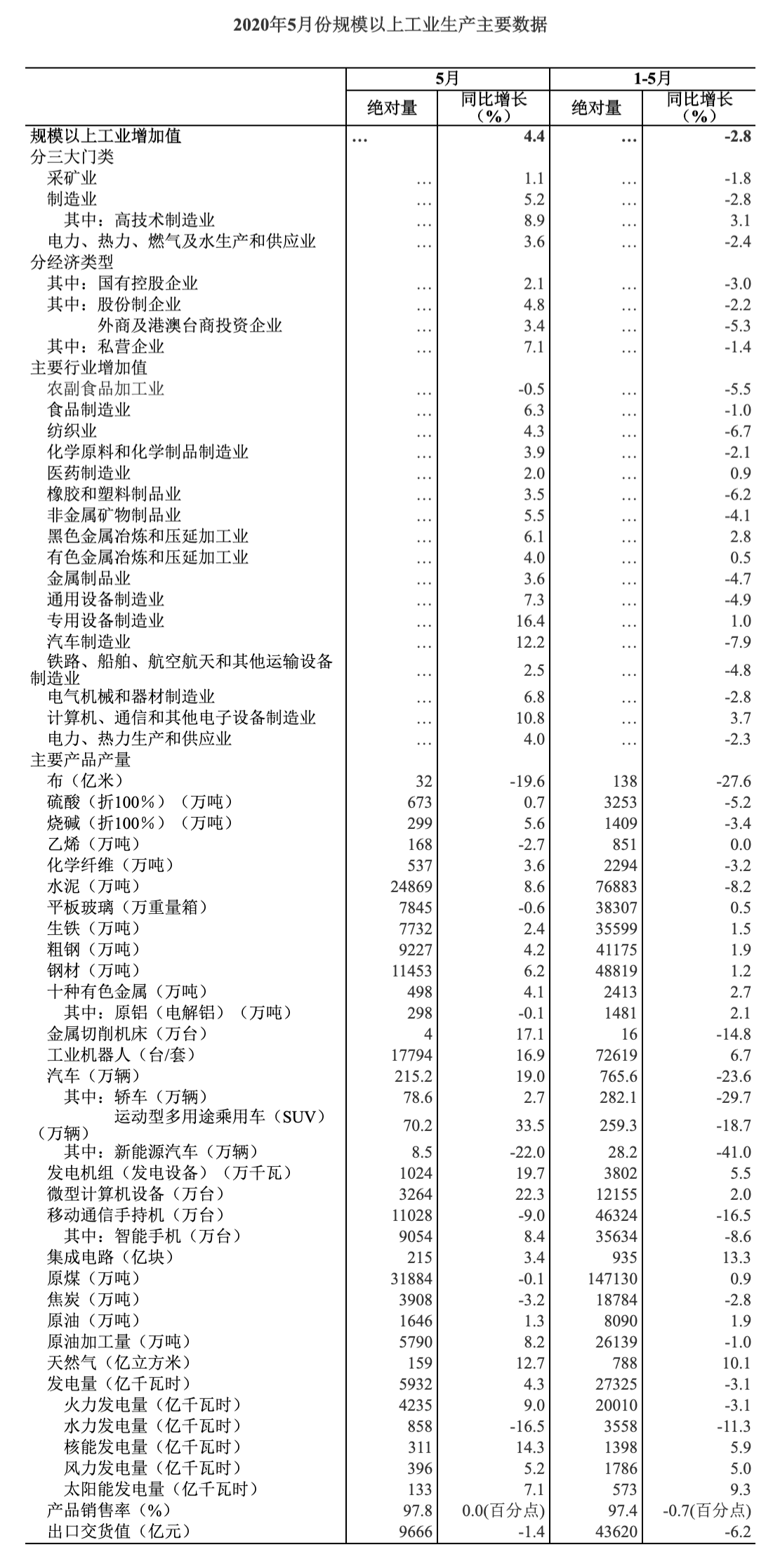 5 月份,规模以上工业增加值同比实际增长 4.4%(以下增加值增速均为扣除价格因素的实际增长率),增速较 4 月份回升 0.5 个百分点。从环比看,5 月份,规模以上工业增加值比上月增长 1.53%。1—5 月份,规模以上工业增加值同比下降 2.8%。