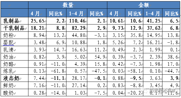 4月我国共计出口各类乳制品3473.89吨,同比减少14.4%,出口额1534.56万美元,同比下降46.9%。